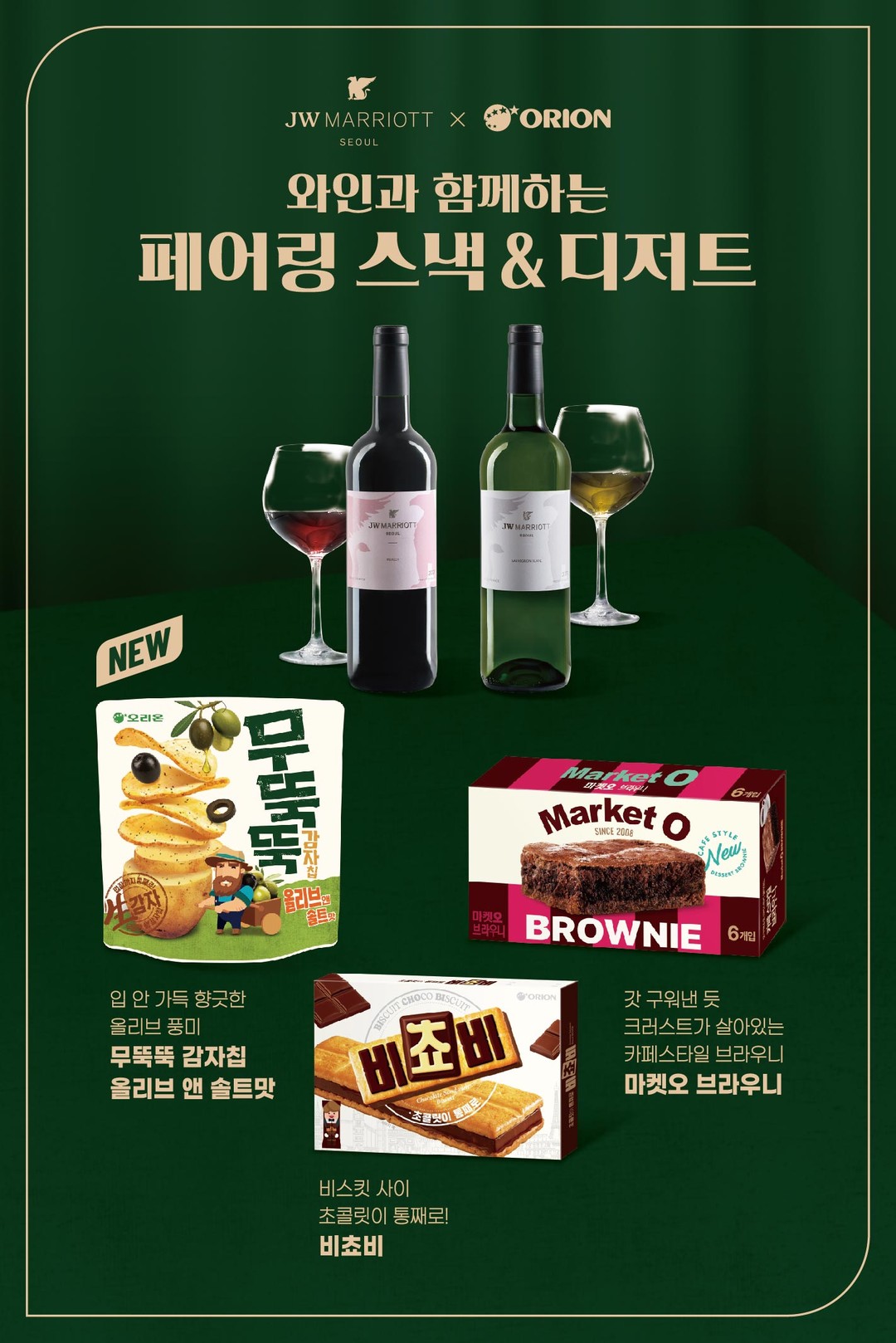 객실에서는 호텔의 시그니처 JW 레드·화이트 와인 하프 보틀 각 1병과 오리온 제과의 MD가 직접 페어링한 ‘무뚝뚝감자칩 올리브앤솔트맛,’ ‘비쵸비,’ ‘마켓오 브라우니’가 포함된 유쾌한 스낵 & 디저트 컬렉션이 제공되어, 아늑한 객실 속에서 단란한 와인 파티를 즐기며 25주년의 기쁨을 함께 나눌 수 있다.