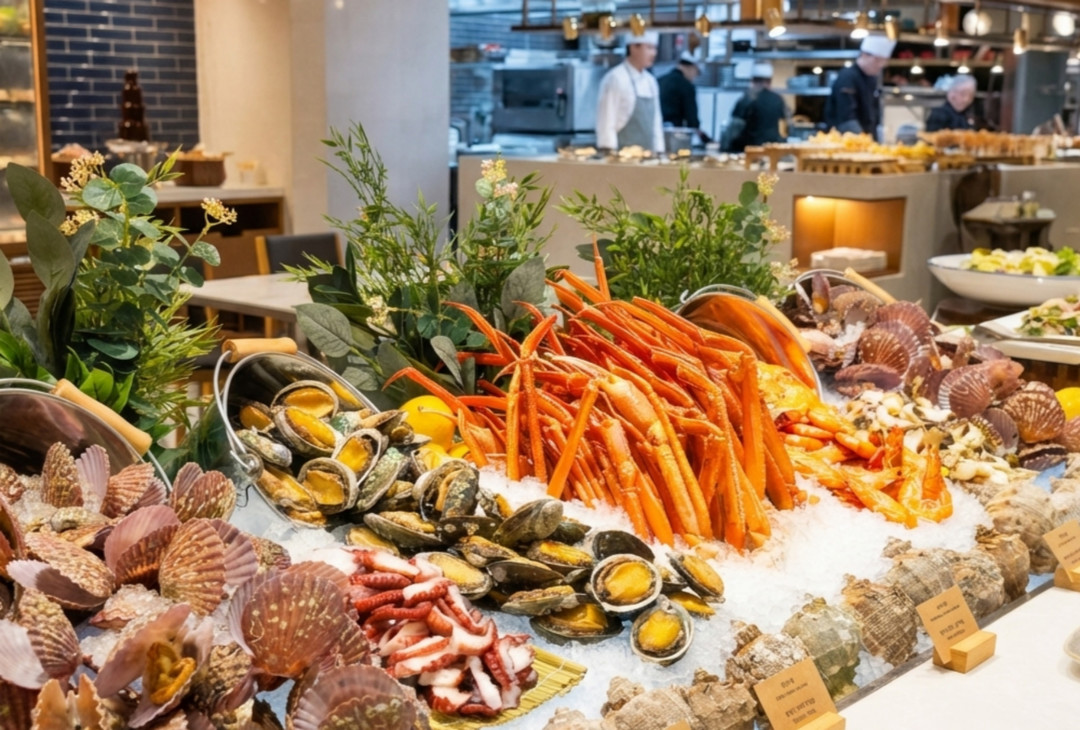 세종키친에서는 시즌 한정으로 해산물 뷔페 라인업을 대폭 강화했다. 레스토랑 입구의 아이스 베드에는 전복, 홍게, 새우, 가리비 등 신선한 해산물이 풍성하게 준비되며, 삼나무에 구운 연어, 해산물 빠삐요트, 방어 세비체, 새우 터미도어, 훈제 연어 타르타르 등 페스티브 시즌에 어울리는 메뉴가 새롭게 추가되었다. 이와 함께 두툼하게 손질한 회와 개인 접시에 정갈하게 제공되는 초밥, 잣 소스 새우 샐러드, 샤퀴테리, 바비큐 폭립, 스테이크, 타코 치킨, 보쌈, 수제 디저트 등 전반적인 구성도 재정비했다. 이번 업그레이드는 전문 메뉴 컨설팅을 바탕으로 진행돼 뷔페 품질과 만족도를 한층 높였다는 평가다.