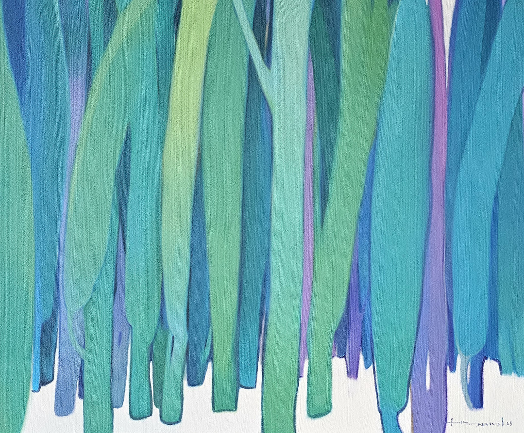 시선과 사색과 영감의 순간, 순간을 존재하며 머물다 보면 어느새 새로운 붓의 길을 찾아가고 있다는 그녀의 작업은 캔버스 위에 붓의 움직임을 자유로이 펼치기로 시작되며, 추상적 의미로 펼쳐진 색상들과 희미한 자국들은 새롭게 구상적 이미지로 탄생 되었다가 또다시 단순화 작업을 시작한다.