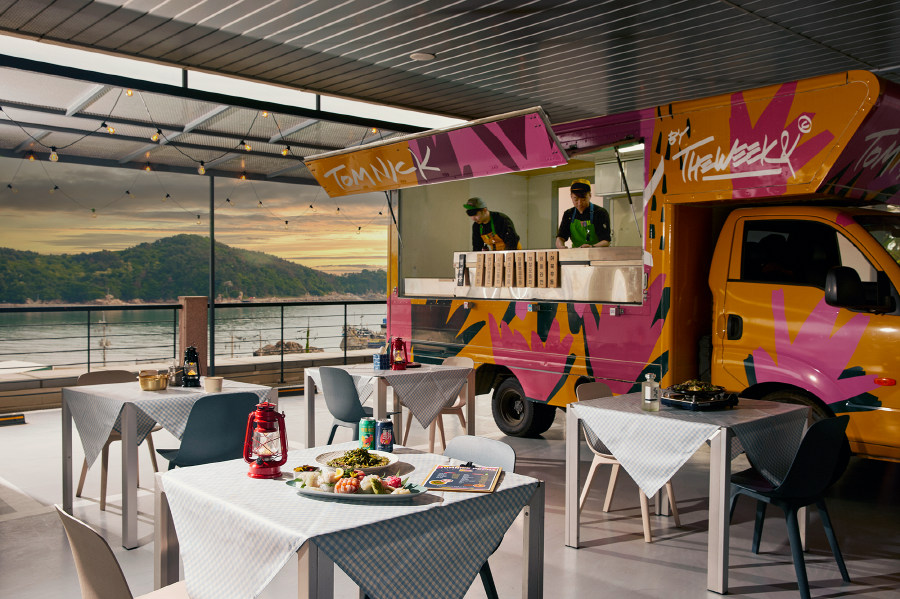 여름을 맞아 포장마차로 재탄생한 푸드트럭은 7월 15일까지 매주 금, 토 저녁 5시 30분부터 10시까지 운영한다. 대표 메뉴는 서해안 물회와 제철 모둠 회, 미나리 해물전 등으로, 친숙한 포장마차 메뉴를 셰프팀의 창의력을 더해 새롭게 선보였다. 포장마차를 운영하는 야외 공간은 탁 트인 해수욕장 뷰와 아름답게 지는 낙조를 감상할 수 있는 것은 물론, 무더운 여름에도 시원한 바닷바람을 선사해 여름 휴식의 특별함을 더할 예정이다.