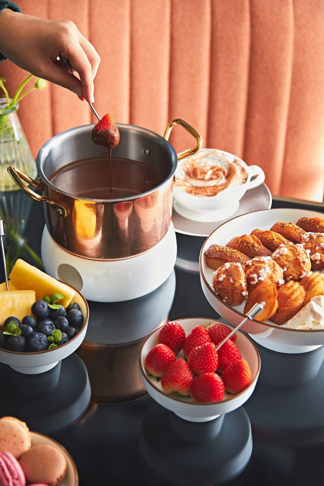 추운 겨울을 따뜻하게 녹여줄 신메뉴, ‘초콜릿 퐁듀 세트’도 만나볼 수 있다. 세트는 끓인 발로나 초콜릿 까라이브 66% (Caraibe, 350g)와 피스타치오 휘낭시에, 슈게트, 레몬 마들렌, 마카롱, 마시멜로우 및 딸기, 블루베리, 파인애플 등의 달콤한 디저트와 상큼한 과일로 다채롭게 구성되어 있다. 이는 취향껏 골라서 콕 찍어 먹을 수 있는 재미와 함께 강력한 달콤함을 느낄 수 있다.