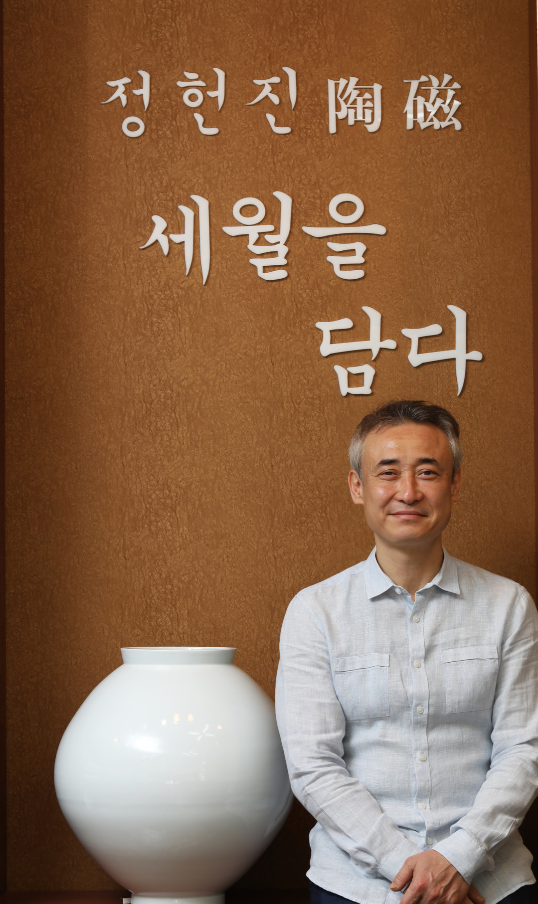 “손가는 대로 빚어놓으면 그릇을 쓰는 사람이 알아서 쓴다”고 말하는 도예가 정헌진의 작품은 그렇게 백색과 청자 빛의 비색을 띠고 삼라만상의 만화경 같은 우주를 들여 보는 듯 하다. 그릇은 운명적으로 곡선을 가질 수밖에 없다. 인간과 인생의 희로애락을 닮아 저절로 경의가 느껴지는 정남의 그릇은 마치 날아가는 한 마리의 백학 같다. 저절로 시심이 떠오르게 하는 정남의 작품 앞에 서면 누구나가 꽉 찬 듯 하지만 빈 마음이 될 것이요, 하나의 작품을 건지고자 수백 개의 실패를 기꺼이 감당하고 태어나는 청화백자이다.