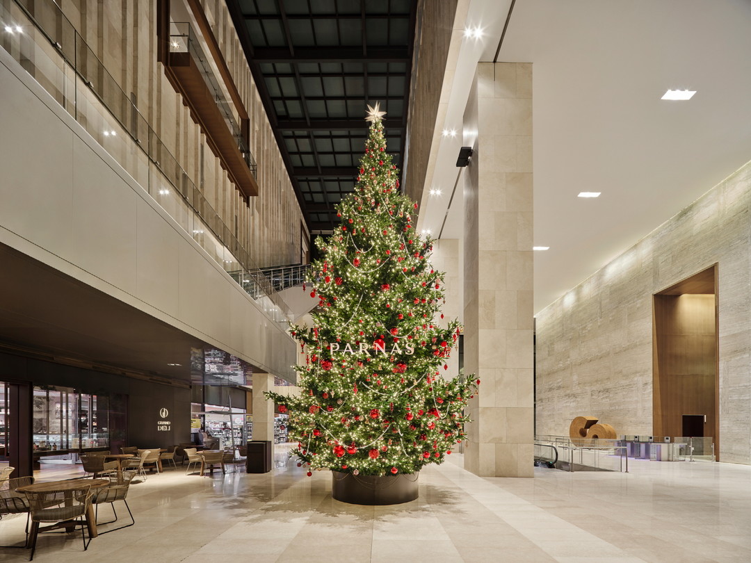 호텔 고객들을 가장 먼저 맞이하는 인터컨티넨탈 파르나스 정문에는 약 50미터 길이의 대형 레드 리본과 은하수 조명 효과를 배경으로 크리스마스 선물상자를 연출한 파사드가 화려하면서도 따뜻한 홀리데이 분위기를 자아낸다. 호텔 정문을 지나 1층 ‘그랜드 델리’ 앞에 서면 형형색색의 페스티브 장식으로 꾸며진 약 10m 높이의 대형 ‘파르나스 트리’가 위풍당당하게 자리하고 있어 고객들의 발걸음과 카메라를 사로잡는다. 레드 컬러를 메인으로 앤티크 골드와 브론즈 컬러가 예술적으로 혼합된 글라스 볼, 비즈와 더불어 호두까기인형, 곰인형, 선물상자 등 다양한 형태의 클래식 오너먼트까지 1,000여 개의 소품들이 트리를 가득 채운다.