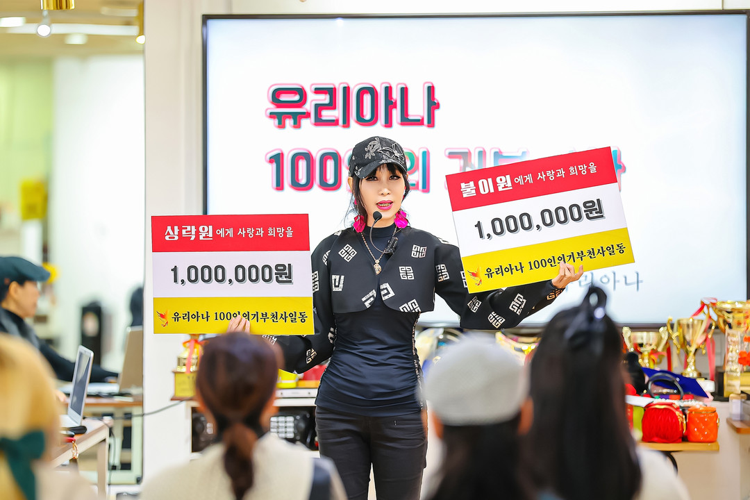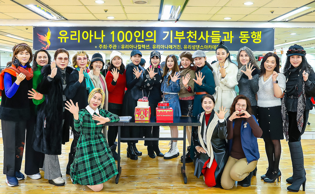 유리아나컬렉션 박영애 대표를 중심으로 세상을 아름답게 만드는 100인의 한국의 시니어 기부천사들은 지난 20일 서울특별시 방배동 소재 유리아나 본사에서 "작은 선행으로 소외계층에게 사랑과 희망을 함께 나누어요."라는 슬로우 건으로 "유리아나 100인의 기부천사와의 동행" 행사를 개최하였다. 이날 행사의 취지에 공감한 전국 각지 100여 명의 시니어들은 협회 사무실에 모여 모금한 성금과 선물들을 경기도 화성시 소재 사회복지법인 노인요양시설 ‘상락원’과 중증장애인시설인 ‘불이원’에 전달했다.