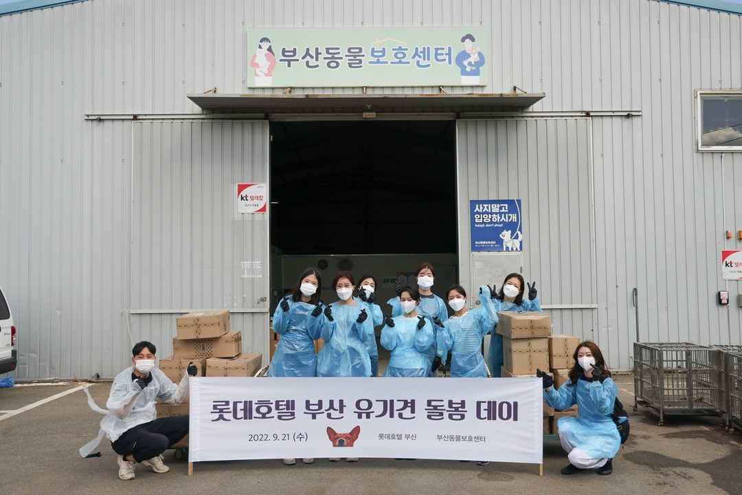 [스마트시니어뉴스=마정수 기자] ㈜부산롯데호텔(대표이사 서정곤)은 지난 21일 부산광역시 강서구에 위치한 유기 동물 보호소 ‘부산 동물보호센터’를 방문하여 돌봄 봉사를 실시했다. 호텔 내 반려동물을 사랑하는 직원들의 모임인 ‘댕그라미’의 구성원이 직접 기획하고 참여하여 진행한 이번 돌봄 봉사는 사회적 거리 두기의 영향으로 중단되었던 지역사회봉사활동을 재개하고 지속적이고 다양한 사회 공헌활동을 실천하여 지역사회의 발전과 함께하고자 하는 임직원들의 움직임이다.