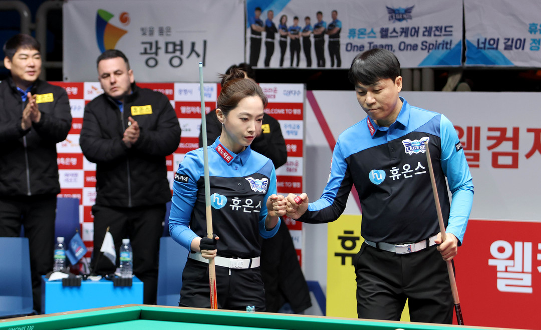 [스마트시니어뉴스=신성식 기자] 종합순위 최하위 휴온스가 달라진 경기력으로 NH농협카드 꺾고 2연승을 질주했다. 20일 경기도 광명시 광명시민체육관에서 열린 ‘웰컴저축은행 PBA 팀리그 광명시 TOUR 2024-2025’ 4라운드 2일차서 휴온스가 NH농협카드를 세트스코어 4:1로 꺾고 2연승을 달렸다. 휴온스는 4라운드 단독 선두(승점 6) 자리를 지켰다.