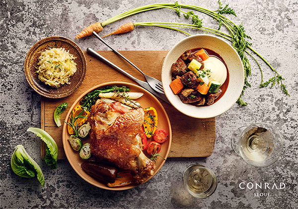 메뉴 구성은 지리산 흑돼지를 이용한 <프로슈토 앤 멜론 샐러드>, 완도 광어로 만드는 <피쉬 앤 칩스>, 횡성 소고기를 활용한 <부르기뇽>, 영천 돼지고기 및 제주 양배추가 조화를 이루는 <슈바인학센>, 그리고 상주곶감으로 만든 <홍시 그라니따>까지 29,000원부터 130,000원 선의 다양한 메뉴 구성으로 눈과 입이 즐거운 미식을 즐길 수 있다.
