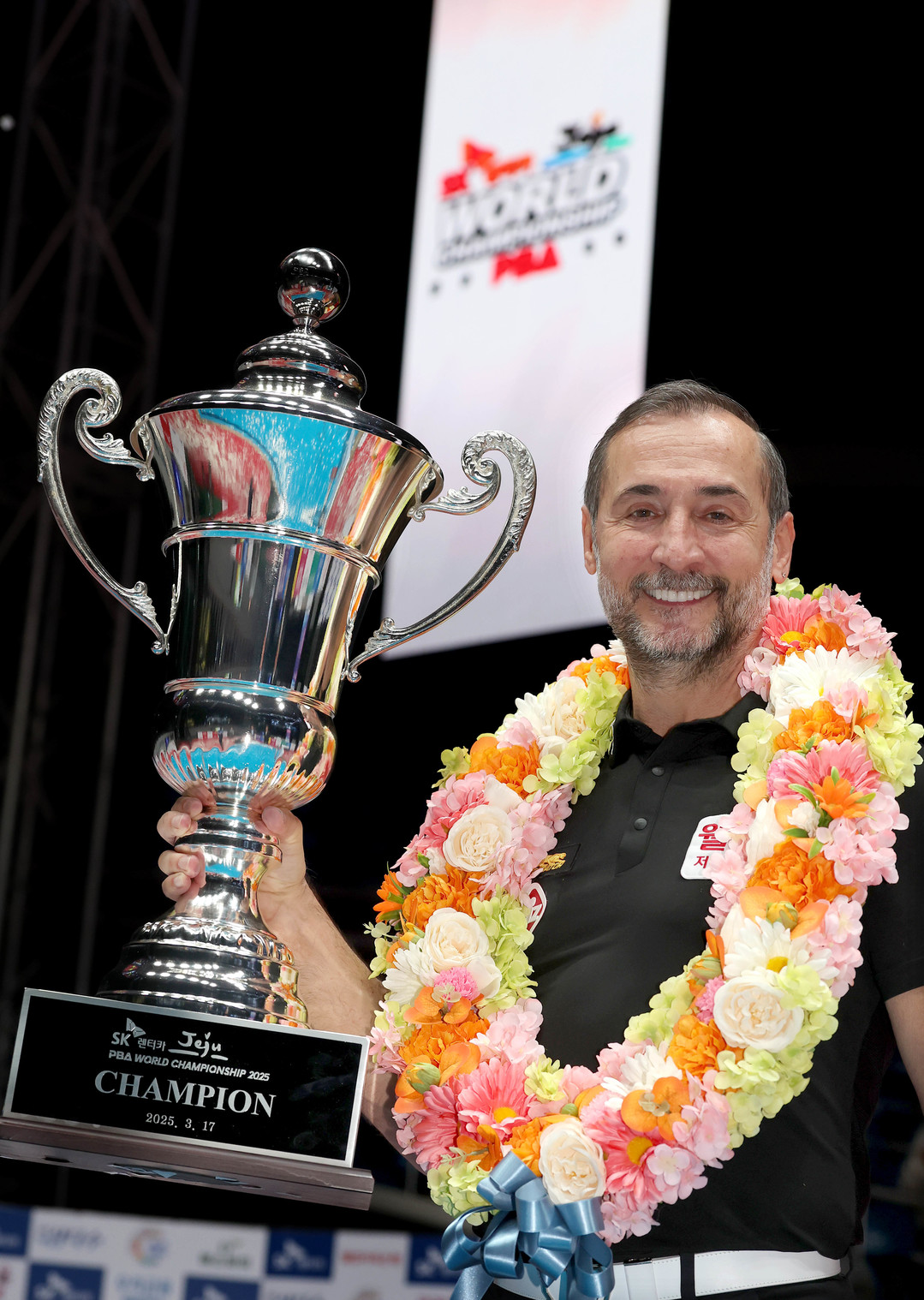 [Smart Senior News=유진모 기자] ‘미스터 매직’ 세미 사이그너(튀르키예·웰컴저축은행)가 환갑의 나이에 PBA 월드챔프에 등극했다. 17일 제주특별자치도 제주시 한라체육관에서 열린 ‘SK렌터카 제주특별자치도 PBA-LPBA 월드챔피언십 2025’ PBA 결승전서 사이그너는 세트스코어 4:1(1:15, 15:2, 15:5, 15:8, 15:7)로 ‘튀르키예 후배’ 륏피 체네트(하이원리조트)를 제치고 정상에 올랐다. 이로써 사이그너는 프로 전향 첫 대회였던 2023-24시즌 개막투어(경주 블루원리조트 챔피언십) 이후 637일 만에 프로당구 개인 통산 2번째 우승 트로피를 품에 안았다. 2023-24시즌 월드챔피언십에서 다비드 사파타(스페인·우리금융캐피탈)에 밀려 4강에 그쳤던 사이그너는 두 번째 기회는 놓치지 않고 시즌 최강자로 우뚝 섰다.