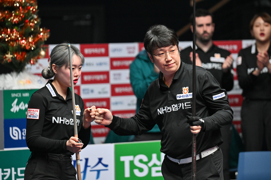 [스마트시니어뉴스=신성식 기자] NH농협카드가 PBA 팀리그 최다연승인 14연승을 질주했다. 3라운드 전승 우승에 이어 4라운드 역시 전승 우승까지 2경기만을 남겨뒀다. 11일 경기도 고양시 ‘고양 킨텍스 PBA 스타디움’에서 열린 ‘웰컴저축은행 PBA 팀리그 2023-2024’ 4라운드 7일차 경기서 NH농협카드는 ‘팀 리더’ 조재호의 2승 활약에 힘입어 휴온스를 세트스코어 4:1로 꺾고 단독 선두(승점16)를 지켰다. 같은 날 우승 경쟁에 있던 크라운해태는 에스와이에 1:4로 패배하면서 승점13으로 제자리, NH농협카드와 격차가 벌어졌다.
