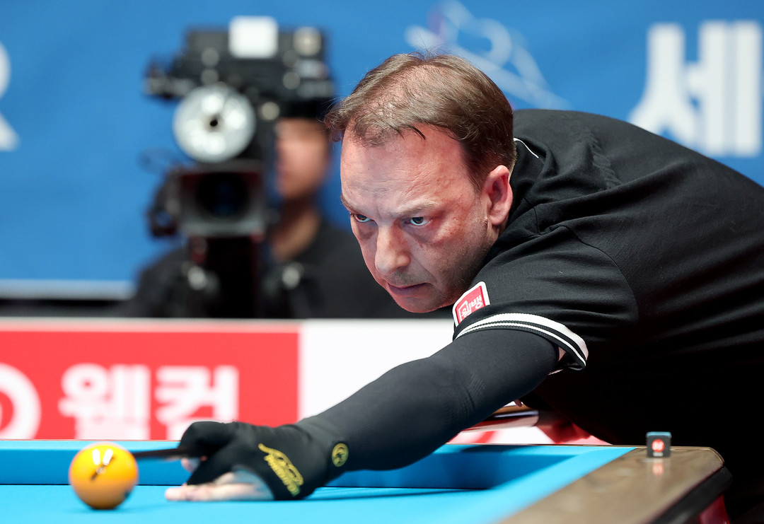 [욜드(YOLD)=조용수 기자] 3연속 우승에 도전하는 ‘3쿠션 전설’ 다니엘 산체스(51·웰컴저축은행)가 대회 무실 세트 우승까지 넘본다. 1일 경기도 고양시 ‘고양 킨텍스 PBA 스타디움’에서 열린 프로당구 2025-26시즌 9차 투어 ‘웰컴저축은행 PBA-LPBA 챔피언십’ 8강전에서 산체스는 김재근(크라운해태)를 세트스코어 3:0(15:7, 15:9, 15:14)으로 제압하고 준결승 무대에 올랐다. 산체스는 15:7(5이닝)로 1세트를 선취했다. 이어진 2세트엔 선공인 김재근이 하이런 9점으로 앞서갔지만, 산체스는 후공 때 하이런 11점으로 응수했다. 기세를 잡은 산체스는 4이닝부터 1-3 연속득점에 성공해 15:9(5이닝)로 승리해 세트스코어 2:0까지 달아났다.