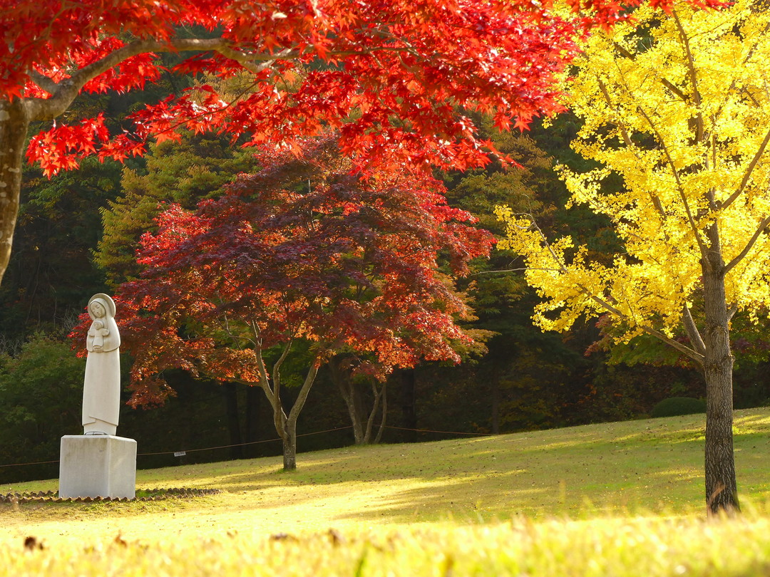 ▲성모자상 과 단풍 | ▲예수 성심상 앞 단풍 | | ▲신학교 알 두명의 선교사 조각상 |