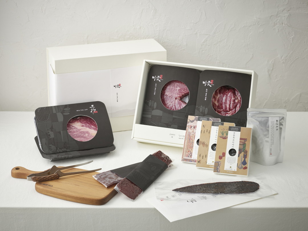 두번째 구성품은 장인정신이 깃든 ‘전통 수제 육포’다. 미:뜻 선물세트의 시그니처로 꼽히는 육포는 특급호텔 VIP 선물이자, 대기업 총수와 경영진들이 즐기는 고급 간식으로 잘 알려진 ‘윤솜씨’에서 제조했다. 무려 3대째 명맥을 잇는 전통적인 제작 방식을 고수하고 있으며, 1등급 이상 무항생제 한우 우둔살에 저온 발효 간장, 설악산 꿀, 예천 참기름, 봉동 생강, 유기농 설탕 등 친환경 및 유기농 재료만을 사용하여 만들어 냈다. 원재료와 사이즈에 따라 장포, 단포, 한입 육포, 와규 육포 중 선택할 수 있다. 특히, 장포는 우둔살 원형 그대로의 생김새를 특징으로 하며, 소 한마리에 서른장 정도 밖에 나오지 않는 귀한 육포다.