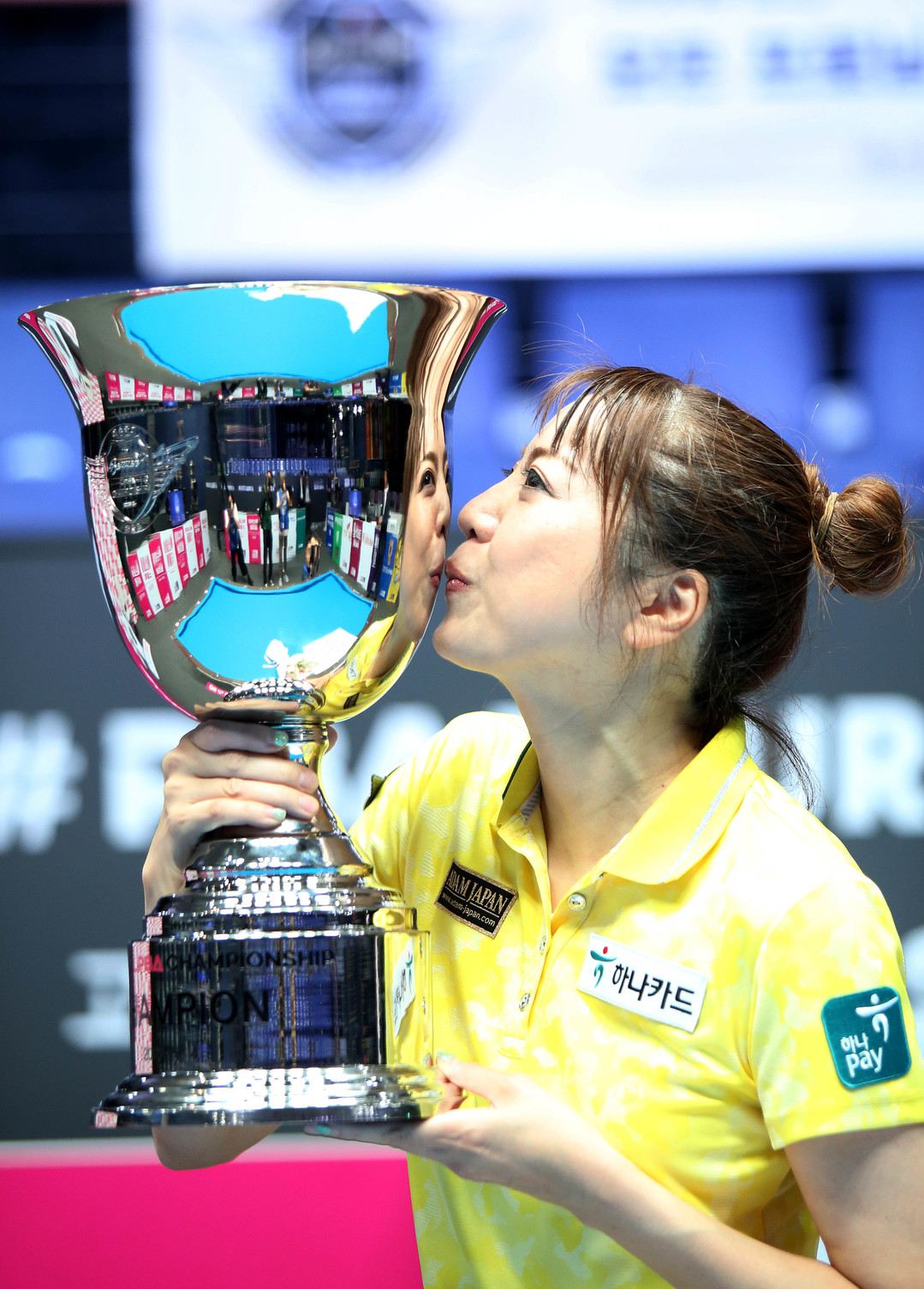 [스마트시니어뉴스=신성식 기자] ‘일본 여자 3쿠션 강호’ 사카이 아야코(하나카드)가 프로 데뷔 4년만에 LPBA 13번째 챔피언에 올랐다. 4일 경기도 고양시 ‘고양 킨텍스 PBA 스타디움’에서 열린 ‘에스와이 LPBA 챔피언십’ 결승전서 김민아(NH농협카드)를 상대로 세트스코어 4:2(8:11, 11:10, 4:11, 11:0, 11:8, 11:6)로 승리를 거두고 상금 3000만원과 프로 첫 우승컵을 들었다.
