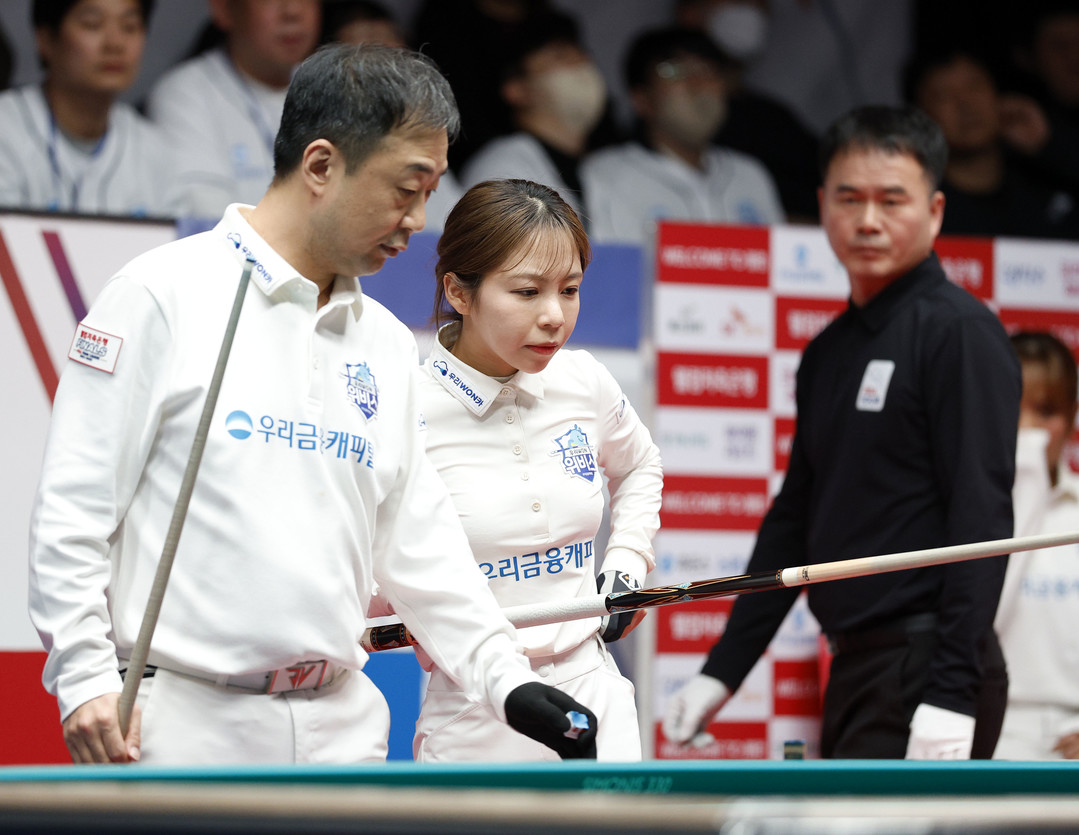 이어진 4차전. 우승까지 1승을 남겨둔 SK렌터카로선 큰 변화를 줄 필요가 없었다. 우리금융캐피탈도 같은 라인업으로 마지막 반격에 나섰다. 물러설 곳 없는 우리금융캐피탈의 열망이 강했다. 선봉에 나선 사파타와 강민구가 4이닝만에 11점을 합작하면서 11:4로 승리, 쾌조의 스타트를 끊었다. 이어 2세트서는 스롱-서한솔이 강지은-히다를 9:6(7이닝), 3세트서는 강민구가 강동궁을 15:7(4이닝)로 제압하면서 빠르게 세트스코어 3:0으로 앞서갔다.
