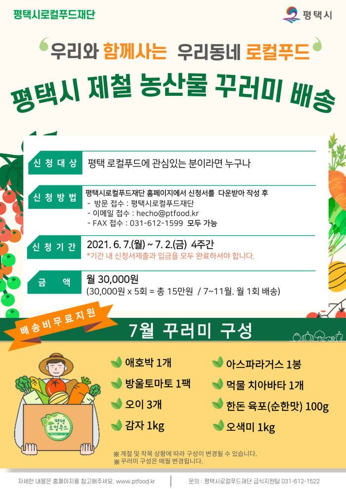 ‘평택시 제철 농산물 꾸러미’ 신청은 재단 홈페이지에서 신청서를 내려받아 작성 후, 안내에 따라 제출하거나 QR 코드를 통해 온라인으로 편리하게 신청서를 작성할 수 있다. ‘평택시 제철 농산물 꾸러미’는 7월부터 11월까지 월 1회씩 택배로 발송되며, 비용은 총 15만원이다. 이용료는 일시불로 지급해야 한다. 신청 기한은 7월 2일(금)까지 이며, 평택시 로컬푸드에 관심이 있는 사람이라면 누구나 신청할 수 있다.