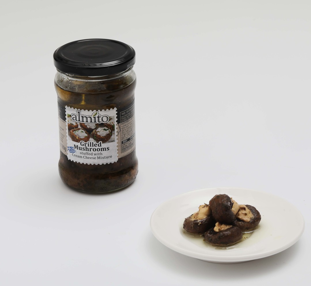 알미토 ‘그릴드 머쉬룸 위드 크림치즈’ 구운 양송이에 고트치즈가 들어간 크림치즈를 듬뿍 채워 넣은 후 후추, 파슬리 등의 허브류와 함께 카놀라유에 재운 절임 치즈류이다. 말캉한 양송이와 고소한 크림치즈가 부드럽게 잘 어울림이 특징이다.