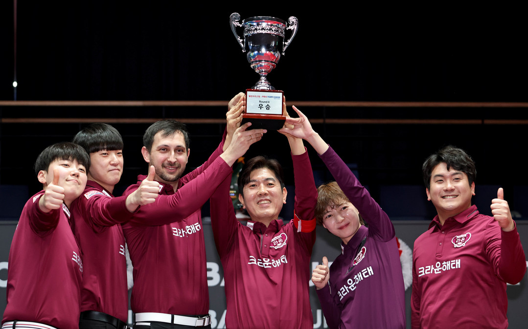 [스마트시니어뉴스=신성식 기자] 크라운해태가 PBA팀리그 4라운드 최종일서 선두 NH농협카드를 꺾고 극적인 우승을 차지했다. 13일 경기도 고양시 ‘고양 킨텍스 PBA 스타디움’에서 열린 ‘웰컴저축은행 PBA 팀리그 2023-2024’ 최종일(9일차) 경기서 크라운해태는 NH농협카드를 세트스코어 4:2(11:10, 7:9, 11:15, 9:3, 11:0, 9:4)로 제압하고 4라운드 1위(5승3패·승점16)에 올라 우승컵을 들었다.