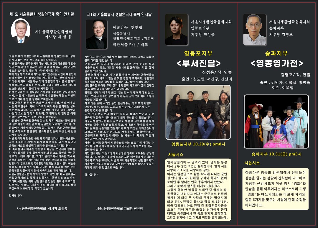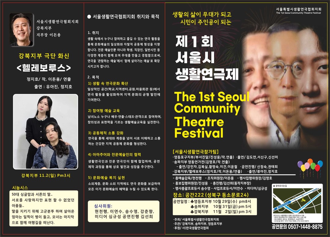 [욜드(YOLD)=신성식 기자] 서울생활연극협회(회장 현천행)가 주최하는 '제1회 서울시 생활연극제'가 오는 10월 29일부터 11월 2일까지 성북구 동소문로에 위치한 공간222에서 성황리에 개최된다. 이번 연극제는 "시민 누구나 참여하고 즐길 수 있는 연극 활동을 통해 지역 문화 활성화와 세대 간 소통을 도모하며, '생활의 삶이 무대가 되고 시민이 주인공이 되는' 예술의 장"을 모토로 삼고 있다.