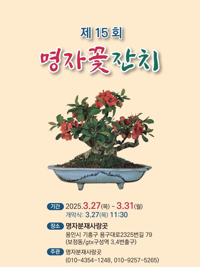심근도 대표는 “명자분재사랑곳은 용인플랫폼시티 개발로 인해 평택시 진위면 야막리 분재원으로 확장 이전하여 K-분재 체험 농원, 분재 교육 과정 등을 운영할 계획이다. 올해를 마지막으로 좀 더 넓고 아늑한 평택시 진위면 야막리, 하북리 명자분재사랑곳에서 K-분재 세계화 시대를 펼칠 예정이니, 이번 3월 27일 ~ 3월 31일 개최되는 ”제15회 명자꽃 잔치“에 많이 방문해 주시기를 거듭 부탁드린다”고 전했다.