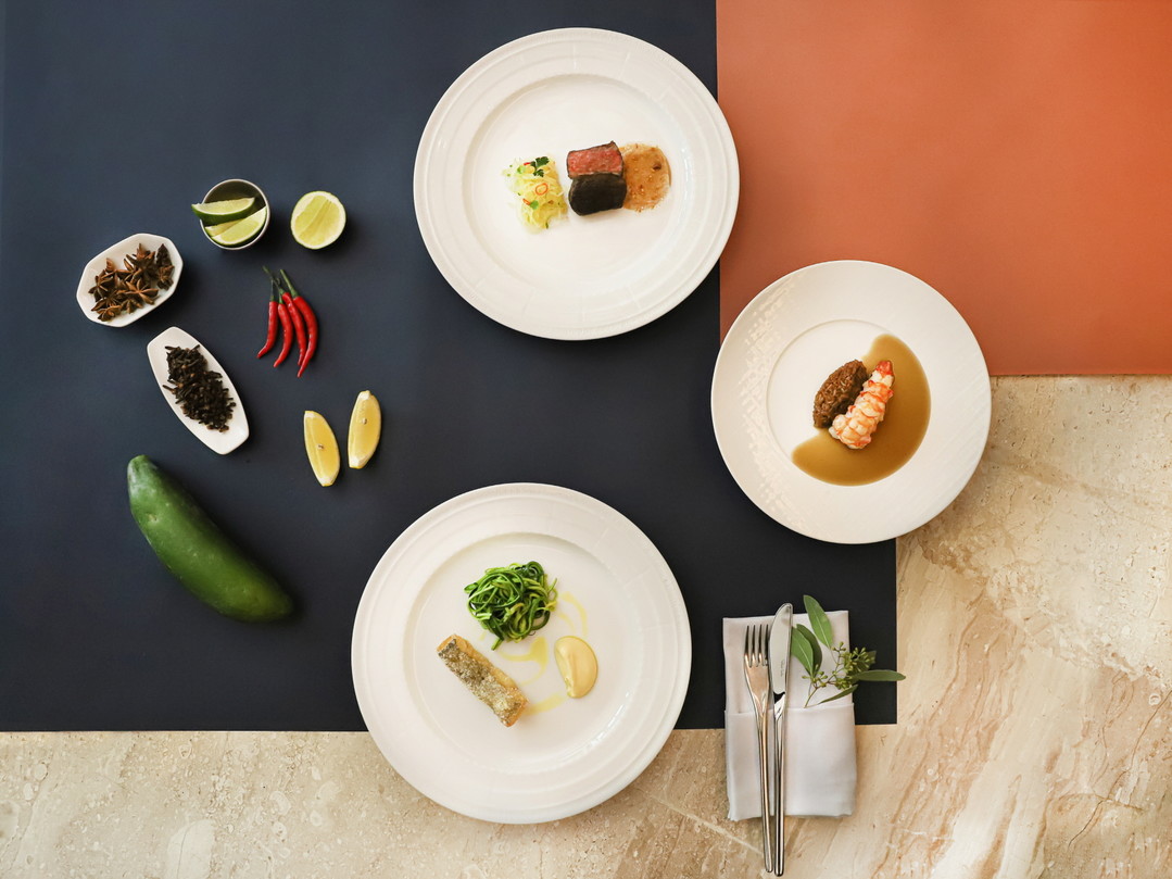 코스 요리는 ▲아시안 터치가 가미된 한입 요리 셀렉션 ▲유자 간장과 참기름을 곁들인 방어 세비체 ▲속초 백명란 브랑다드 라자냐와 어란 파우더 ▲땅콩소스를 곁들인 최상급 1++ 한우 숯불구이 ▲숯불에 구운 랍스터와 타이풍 커리 소스, 찹쌀 리조또, 캐비아 ▲제주 옥돔 튀김과 그린 커리 베어네즈 소스 ▲셰프가 엄선한 오늘의 디저트 ▲커피 또는 차 등을 포함한다. 구성은 런치와 디너에 따라 달라진다.