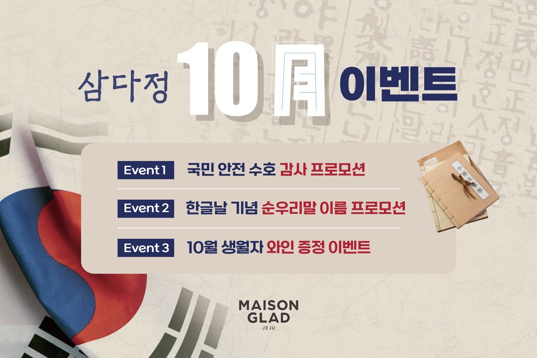 글래드 호텔 마케팅 관계자는 “제주 도민 맛집 ‘삼다정’에서 10월을 맞이하여 다채로운 프로모션을 마련했다”라면서 “국가 안보와 국민을 위해 일하는 공무원에게 감사의 마음이 담긴 프로모션, 순우리말 이름, 생일 고객 대상 프로모션 등 풍성한 혜택과 함께 가을 미식을 즐겨 보시길 바란다”고 전했다.