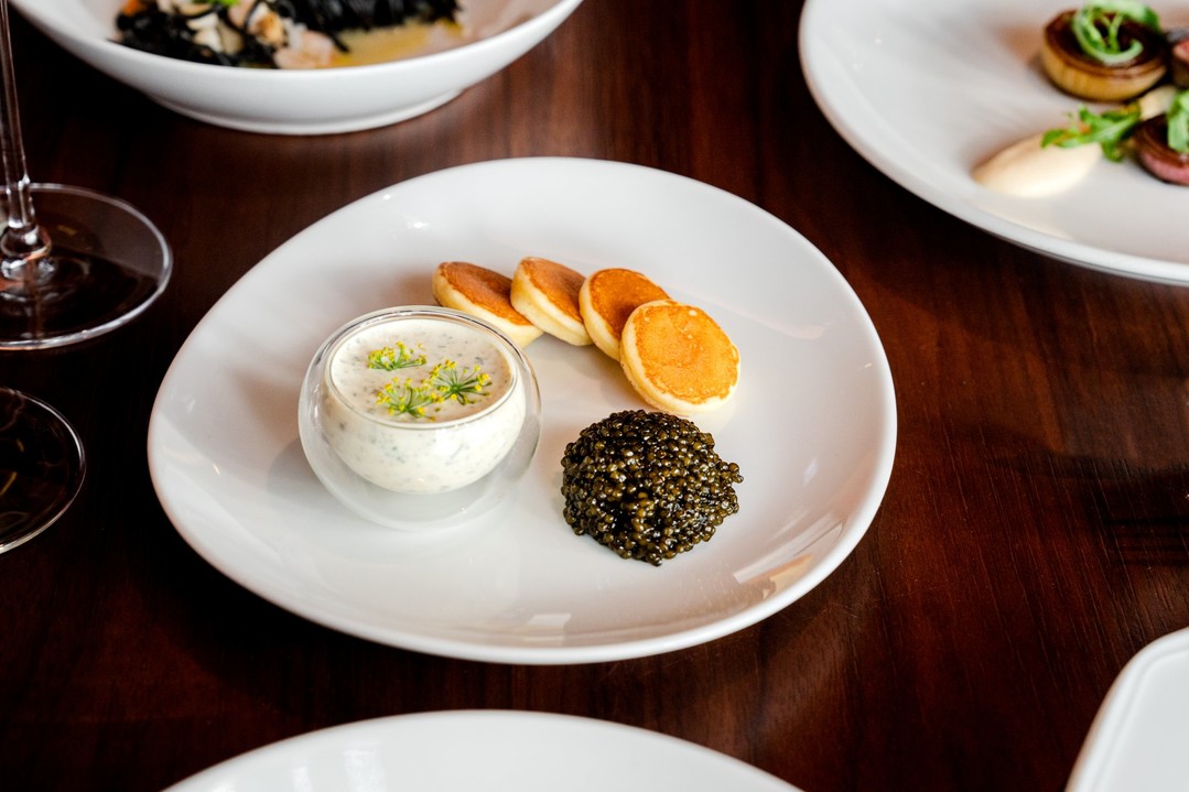 코스의 첫 번째 메뉴로는 1인당 약 30g의 N25 프리미엄 캐비어와 럭셔리한 돔 페리뇽 빈티지 2013 샴페인 (2013 Dom Perignon Brut Reims)이 제공돼 풍미 깊은 캐비어를 충분히 음미할 수 있다. N25 캐비어는 파크 하얏트 서울이 독일에서 독점 직수입한 프리미엄 캐비어 브랜드로 독일의 까다로운 선별 과정과 냉동 없는 저온 살균의 특별한 숙성 과정을 거쳐 최상의 품질을 자랑한다. 돔 페리뇽 샴페인의 토스티함과 부드러운 버블과 캐비어의 신선한 맛과 텍스처가 최상의 마리아주를 선사한다. 또한, 사워크림과 케이퍼, 파슬리, 달걀 흰자와 노른자를 다져 황금 비율로 믹스한 컨디멘탈과 블리니가 함께 제공돼 취향에 맞게 즐길 수 있다. 이어서 제공되는 버팔로 모차렐라 카프레제는 달콤한 매실즙으로 마리네이드한 토마토와 콘소메 소스, 모차렐라 치즈가 만나 산미와 당도의 환상적인 밸런스로 입맛을 돋운다.