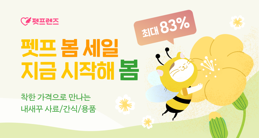 펫프렌즈에 새롭게 입고한 신제품과 베스트 판매 제품들도 준비돼 있다. 오직 펫프렌즈에서만 만날 수 있는 '이나바 캣 트윈컵 테린 참치&닭가슴살 70g'은 23% 할인하며, '요요쉬 프로랄와인 소형 50매'는 37% 할인 판매한다. 이 외에도 내 새꾸 사료, 간식, 용품 카테고리에서는 봄철 입맛을 돋워줄 간식과 사료는 물론 봄맞이 새단장을 위한 화장실, 식기 등 다양한 반려동물 용품들을 파격적인 할인가로 만날 수 있다.