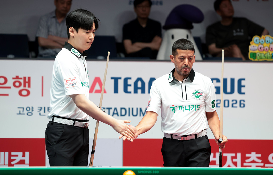 [욜드(YOLD)=조용수 기자] 신생팀 하림이 PBA 팀리그 1라운드 초반 상승세를 달리고 있다. 24일 경기도 고양시 ‘고양 킨텍스 PBA 스타디움’에서 열린 ‘웰컴저축은행 PBA 팀리그 2025-2026’ 1라운드 대회 3일차서 하림이 휴온스를 세트스코어 4:0으로 제압하고 2연승을 질주했다.