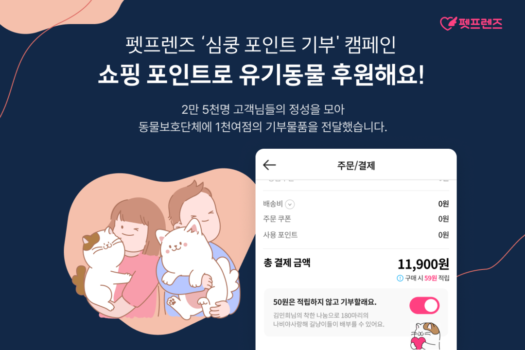 [스마트시니어뉴스=이문섭 기자] 반려동물 1등 쇼핑몰 펫프렌즈가 결제 적립 포인트를 기부할 수 있는 ‘심쿵 포인트 기부’ 캠페인을 선보이며 MZ세대를 중심으로 한 새로운 기부 문화를 이끌어 나간다. 사랑의열매 사회복지공동모금회가 발표한 ‘2022 기부 트렌드 보고서’에 따르면 MZ세대(밀레니얼+Z세대)는 일상 속에서 소소하게 실천하는 기부를 추구하고, 가치 있는 소비처럼 기부를 대하며 거창한 기부보다 재미와 자기 만족을 중시한다.
