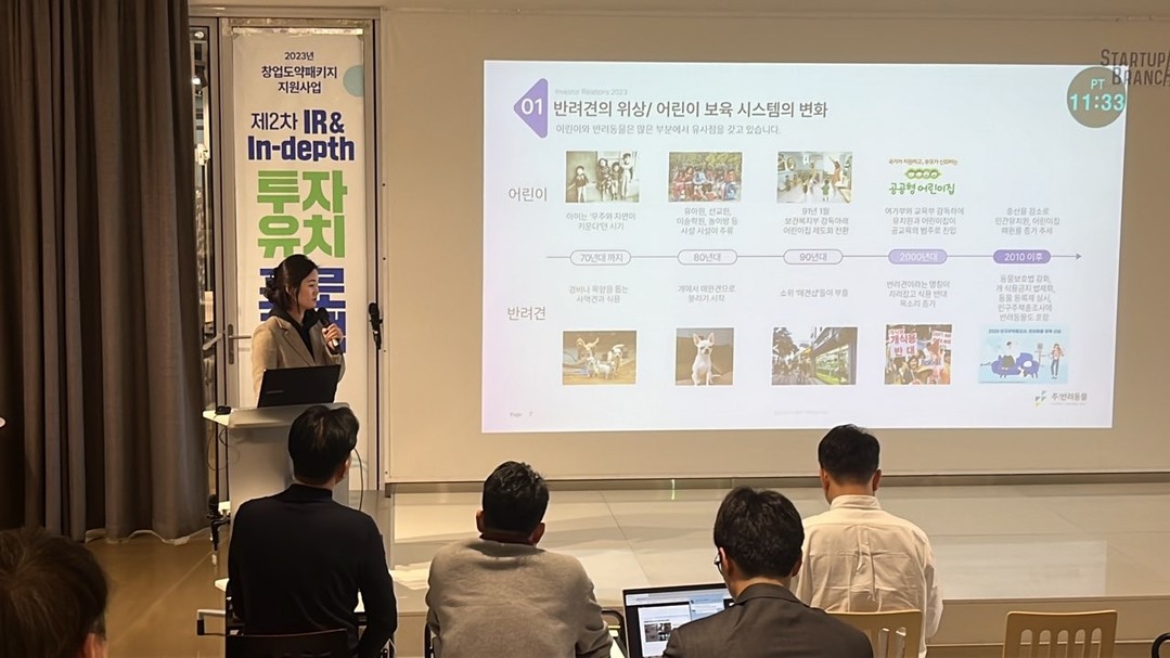 이날 제2차 IR&in-depth 투자유치프로그램에는 반려동물에 관심이 있는 많은 투자자들이 ㈜반려동물의 강아지 유치원 ‘털로덮인친구들’의 프랜차이즈 모델사업에 관심을 보였다. 그 이유 중 하나로 2010년 이후 동물보호법이 강화되고, 개 식용금지가 법제화 되면서 인구주택총조사에 반려동물이 포함될 정도로 위상이 높아졌고 반려동물에 대한 제도적 환경이 변한 것이 주 요인인 것으로 판단하고 있다.