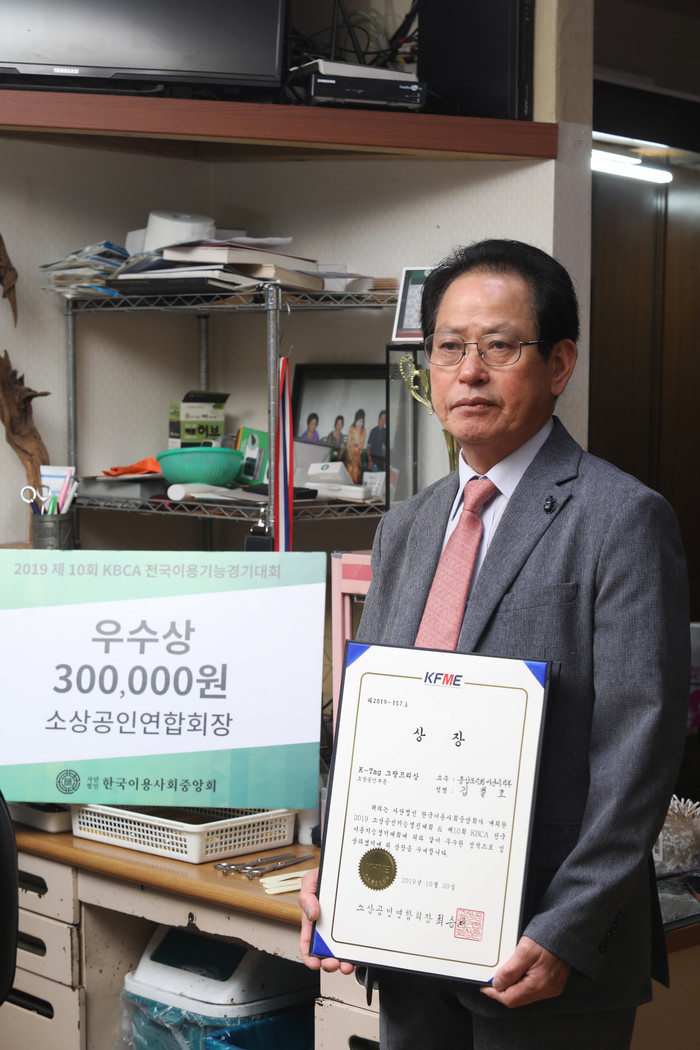 손님이 꾸준하게 드는 이용원을 운영하면서 먼 서울에서 열리는 경진대회에 어떻게 참가할 수 있었을까. 처음 출전한 것도 아니라는 김철호 대표는 이번 경진대회가 두 번째 참가란다. 기회가 생길 때마다 경진대회에 참가하고 싶다는 김철호 대표는 경진대회에 출품하는 작품들을 보며 배움의 장으로 삼겠다는 의지로 참여했는데 예상치도 않게 우수상을 받게 되어 놀랐다고 한다. 그의 이름을 발견했을 때 설마 하는 생각에 확인하고 또 확인했다고.