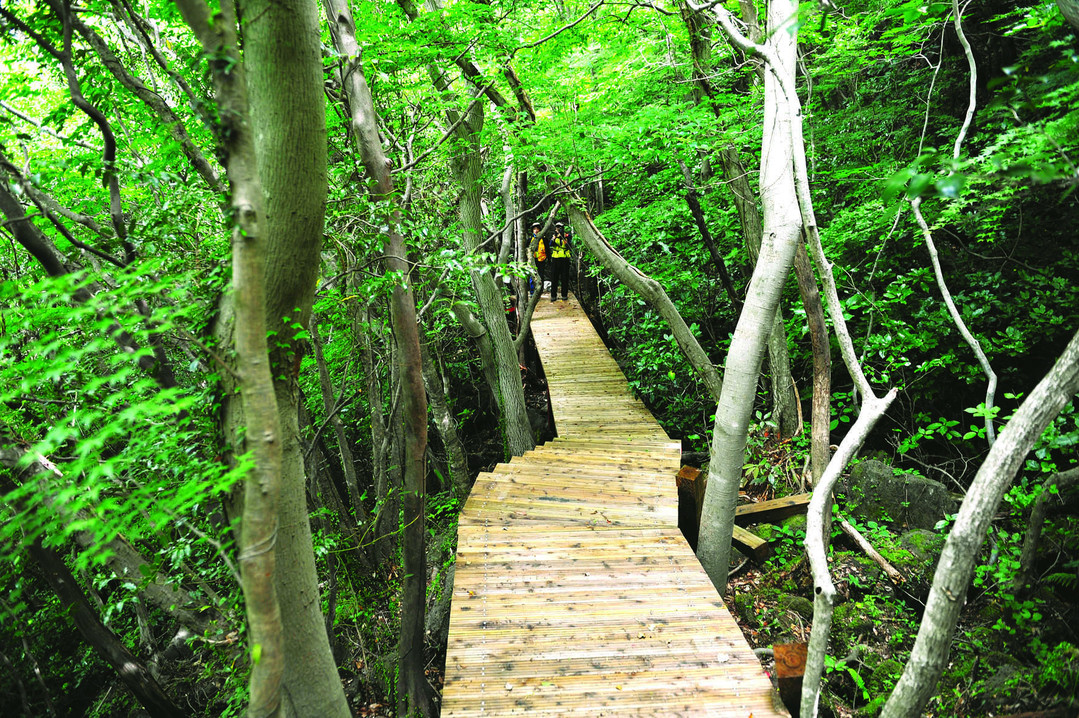 2일 전까지 예약해야 탐방가능우선 숲이 우거진 분화구코스를 따라 길을 잡자 눈에 띄는 건 용암협곡. 화산 분화구로부터 공급되는 용암류가 연속적으로 흐르면서 용암동굴의 천장 및 주변 가장자리가 붕괴되면서 형성된 구조인 용암협곡을 지나자 국내 최대인 식나무 군락지와 붓순나무 군락지가 차례로 나타난다. 식나무와 붓순나무는 관상수로 각광받고 있는 희귀식물로 이곳처럼 군락을 이루는 경우는 드물다는 설명. 특히 거문오름 일대에는 삼나무림, 낙엽활엽수림, 관목림 및 초지, 상록활엽수림 등 4개의 숲으로 구분할 수 있는데 이처럼 아열대, 난대, 온대에 거쳐 식물들이 나타나는 것은 그만큼 거문오름이 다양한 생장 환경을 갖고 있다는 반증이기도 할 것이다.