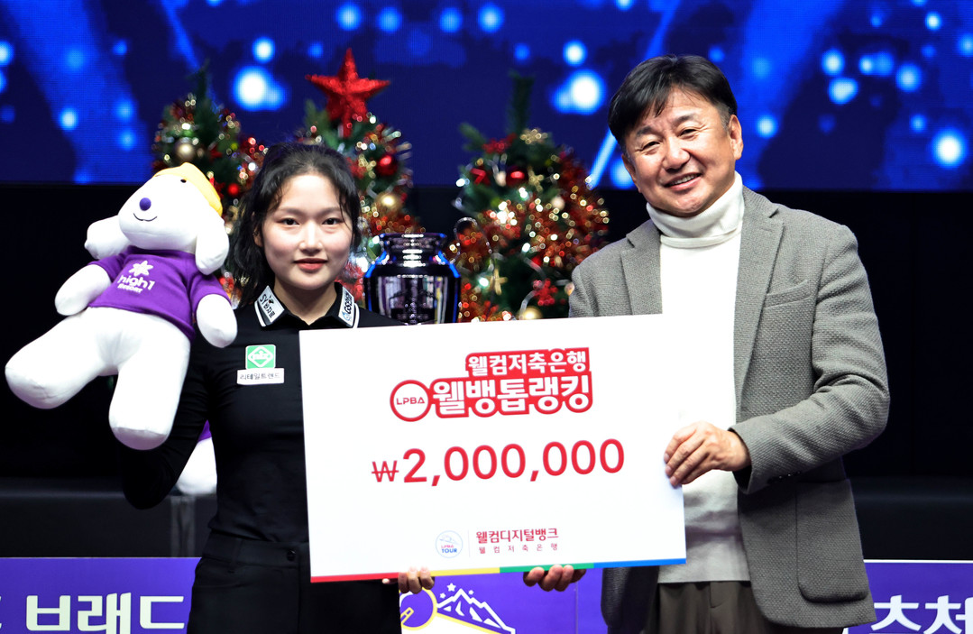 대회 한 경기서 가장 높은 애버리지를 기록한 선수에게 주어지는 ‘웰뱅톱랭킹’(상금 200만원)은 32강서 이다정을 상대로 애버리지 2.200을 기록, LPBA 역대 세트제 최고 애버리지 타이 기록을 쓴 한지은이 수상했다.