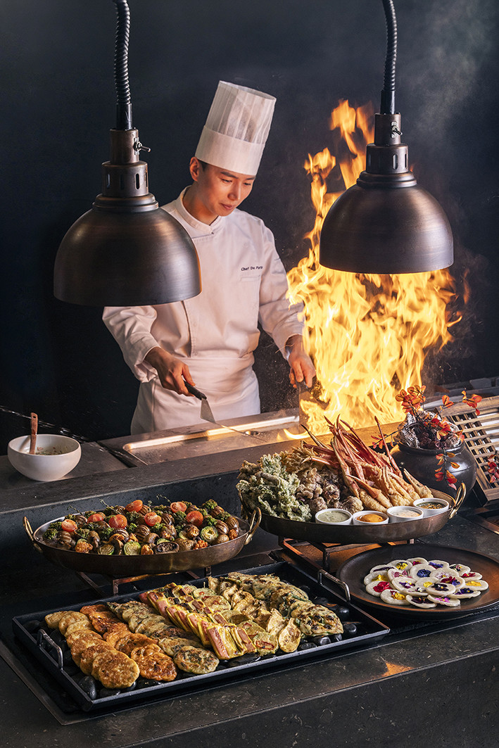 패키지에 포함된 ‘데메테르 스페셜 설 디너 뷔페’는 연휴의 미식 경험을 한층 풍성하게 만든다. 세 가지 테마로 기획된 이번 뷔페에서는 즉석 모둠전, 해물 갈비찜, 한방 수육 등 명절 대표 메뉴를 다채롭게 선보이며, 여기에 셰프가 마블링이 풍부한 한우를 라이브 스테이션에서 구워 즉석으로 제공해, 육즙 가득한 한우를 맛볼 수 있다. 특히 일본 후쿠오카에서 온 게스트 셰프 ‘하기와라’가 선보이는 후쿠오카 대표 인기 메뉴들과 제철 해산물 사시미, 와규 함박 스테이크 등 갓포가 더해져 다이닝의 완성도를 높인다. 연휴 기간에는 생맥주 프리 플로우 혜택도 함께 제공되어 더욱 즐거운 다이닝 시간을 보낼 수 있다.