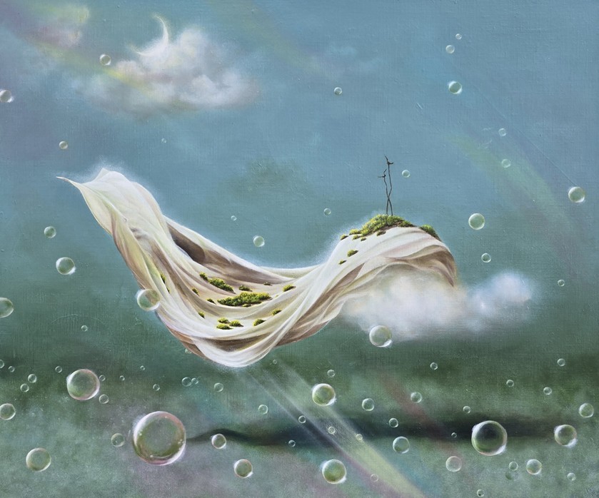조형적 측면에서 이 작품은 탁월한 완성도를 보여준다. 화면을 가로지르는 천의 유기적 S자 곡선은 관람자의 시선을 자연스럽게 유도하며 역동적 흐름을 만들어낸다. 천 위에 자리한 식생과 우아한 주름은 생명력과 움직임을 동시에 표현하며, 수직으로 선 가느다란 조형물은 유일한 직선 요소로서 유동적인 곡선들과 긴장감 있는 대비를 형성한다. 화면 전체를 떠다니는 크고 작은 투명한 비누방울들은 작품에 환상적인 깊이를 부여하는 동시에, 기억과 감정의 흔적을 상징한다. 아름답지만 덧없는 비눗방울은 과거의 순간들, 사라져가는 감정들, 시간의 흐름 속에서 떠오르는 기억의 파편들을 시각화하면서도, 순수함과 희망, 여전히 가능성으로 남아 있는 미래의 모습을 담고 있다.