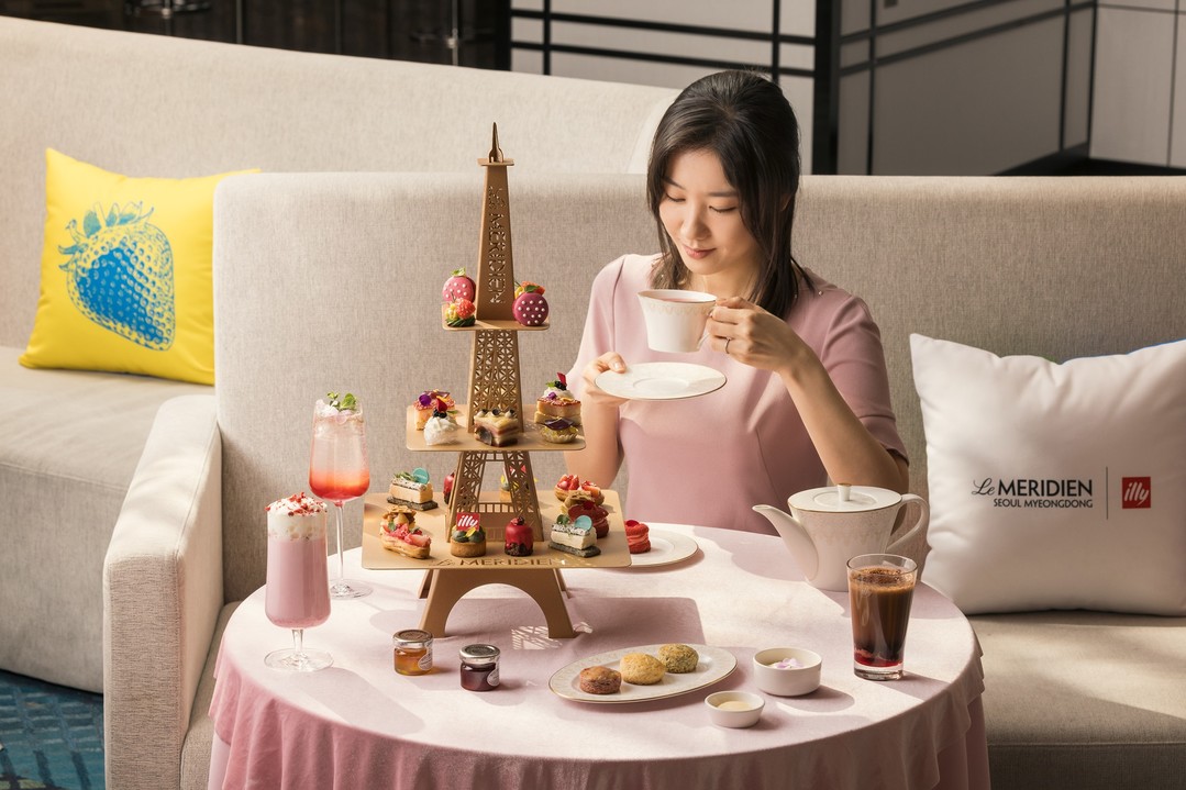 먼저, 딸기를 감각적으로 표현한 앙증맞은 비주얼의 라즈베리 마카롱과 프랑스 전통 디저트인 카눌레에 딸기 가루를 첨가한 딸기 카눌레, 제철 재료인 유자와 쑥을 활용해 꿀리와 가나슈를 만들어 데커레이션한 쑥 유자 타르트, 딸기 버터크림을 샌드해 달콤한 하겔슈가로 마무리한 크런치 딸기 파리브레스트, 캐러멜라이징한 잣과 크램릴레 무스를 올린 캐러멜 다쿠아즈, 흑임자 사브레 위 두유를 사용해 만든 무스를 얹은 밀크 크레망, 히비스커스 아카시아 겔과 딸기 크레뫼를 채운 에클레어에 딸기 데코를 더한 아카시아 베리 에클레어, 아몬드 페이스트를 활용해 만든 쿠키 위 피스타치오 크림과 딸기를 데코해 완성한 쫀득한 쿠키 딸기 피스타치오 마카로나드 등이 디저트로 준비되며, 부라타 무스와 12년산 발사믹을 곁들여 풍미를 더한 크리스탈 브레드, 신선한 관자에 레드와인 겔을 곁들인 관자 타르타르, 프랑스 전통 크로크무슈에 트러플 특유의 향미를 더한 트러플 크로크무슈, 해산물 테린 위 토마토 크러스트를 올린 토마토 크러스트 해산물 테린 등이 세이보리로 준비된다.