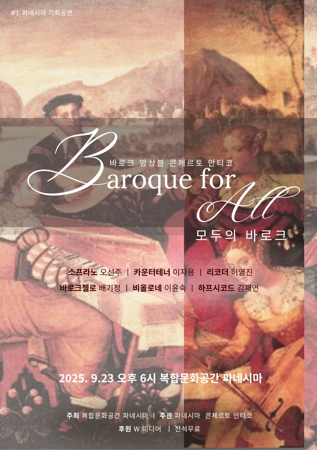 이번 음악회는 단순한 고전음악 연주회가 아니라, 모두가 함께 즐길 수 있는 음악적 축제이다. 바로크 음악의 화려하면서도 친숙한 선율은 처음 접하는 관객에게는 신선하게 다가오고, 이미 알고 있는 관객에게는 깊은 감동을 다시 불러일으킬 것이다. 리코더의 맑고 경쾌한 선율, 첼로와 비올로네의 따뜻한 저음, 하프시코드의 화려한 울림, 그리고 성악의 감동적인 아리아가 어우러져 일상 속에서 잠시 벗어나 여유와 위로를 느낄 수 있는 시간이 될 것이다. 파네시마 복합문화공간의 아늑한 분위기와 어울리는 이번 무대는, 클래식 애호가는 물론 남녀노소 누구나 쉽게 다가와 즐길 수 있는 음악회로 준비되었다.