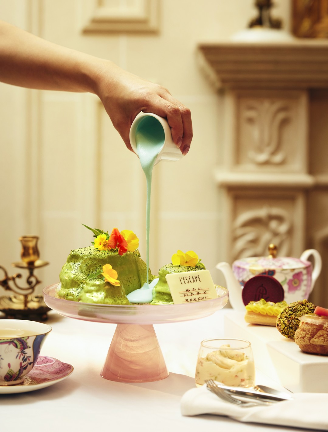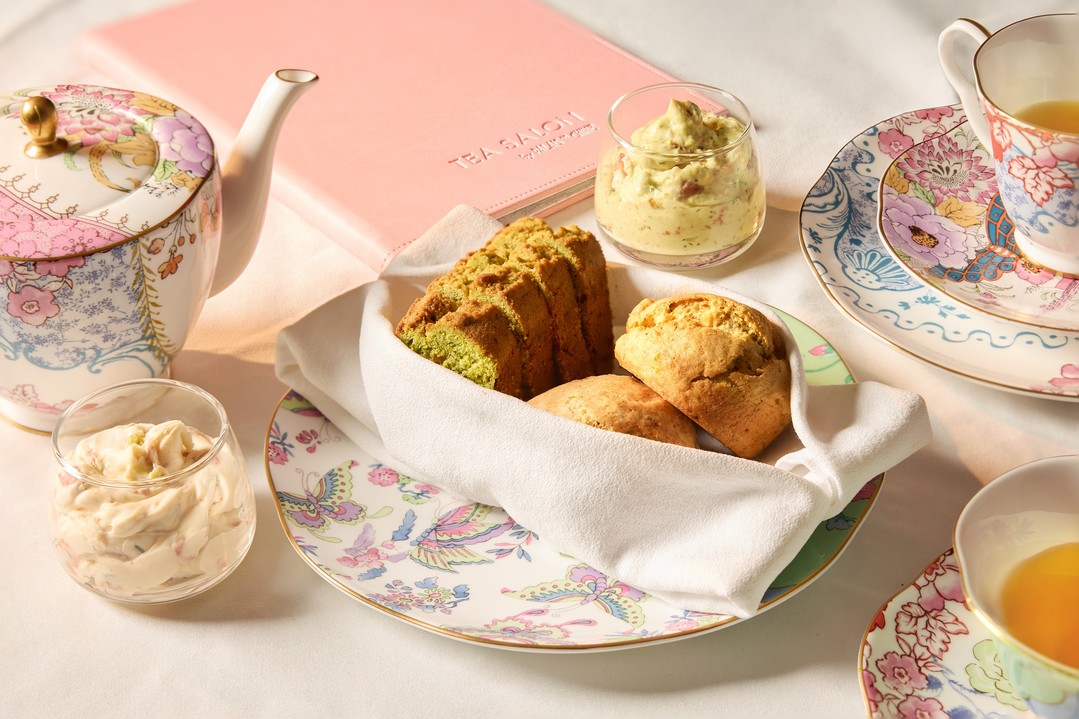 디저트는 총 3가지 플레이트로 제공되며 웨지우드 플레이트에는 바질의 향긋함이 은은하게 퍼지는 ‘바질 가든 파운드’, 세이보리 디저트인 블랙 페퍼 스콘과 ‘사우어 초리조 크림치즈 & 바질 선드라이 토마토 크림치즈’가 담긴다. 숲 속의 생동감을 콘셉트로 디저트를 구성한 화이트 플레이트에는 상큼한 ‘젤로우 핑크 루바브 슈’와 ‘그리너리 피스타치오 마들렌’, 라즈베리 가나슈가 들어간 ‘레드벨벳 샌드’, 그리고 초록색 숲의 모습을 형상화한 디저트를 담은 핑크 플레이트에는 화이트 조콩드 시트에 말차 크림을 올리고 안에는 오렌지 콩피츄어로 채운 뒤 블루 큐라소 크림으로 흐르는 시냇물을 표현한 독창적인 비주얼의 ‘쁘띠 포레스트 말차 케이크’가 준비된다. 함께 곁들이는 티(tea)로는 화이트 벨리니, 로얄 카모마일, 얼그레이 등이 준비되며 아메리카노, 카페라떼 등 커피 메뉴로도 변경 가능하다.