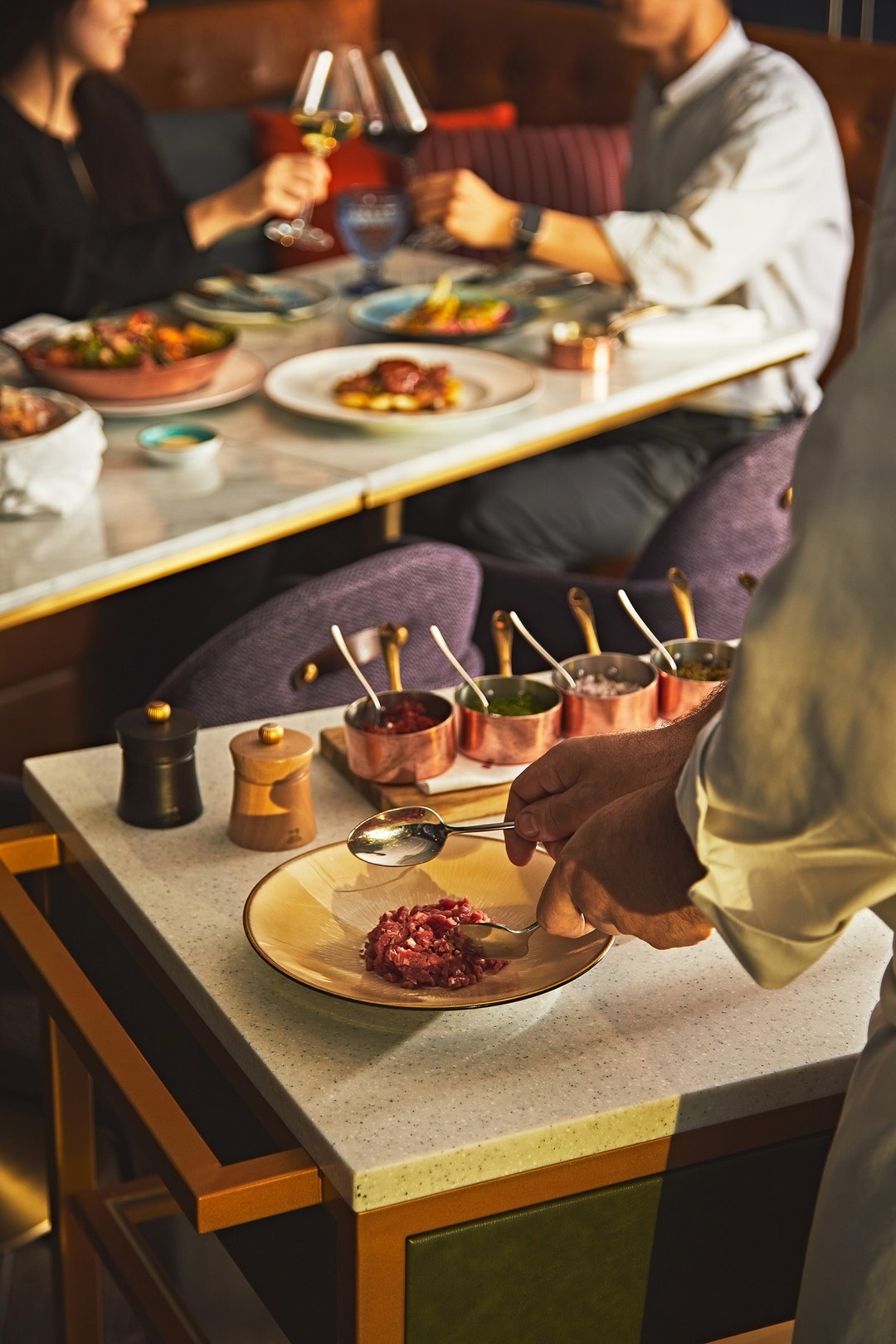 JW 메리어트 호텔 서울의 7층에 위치한 ‘더 마고 그릴(The Margaux Grill)’에서는 도심 속 자연의 모습을 구현한 정원에 둘러싸인 글라스 하우스 공간에서 우아한 분위기와 함께 그릴 전문 셰프로부터의 오트 퀴진을 선사하고 있다. 더 마고 그릴에서는 미식의 순간을 더욱 특별하게 해 줄 ‘게리동 서비스 (Gueridon Service)’를 준비했다. 프랑스의 문화 중 하나인 이 서비스는 정교한 프렌치 퀴진을 선보이기 위해 바퀴가 달린 테이블을 사용해 고객 앞에서 음식을 직접 조리해 제공하는 서비스를 뜻하며, 더 마고 그릴에서는 이 서비스를 이용해 ‘한우 1++ 타르타르’ 메뉴를 선보인다. 신선한 샬롯과 케이퍼가 풍부하게 함유된 드레싱을 비롯한 각종 재료를 이용해 고객의 기호를 반영해 눈앞에서 조리의 과정을 선뵈며 제공하는 이 요리는 게리동 서비스와 함께 최상급 한우 1++의 안심 부위만을 사용해 부드럽고 고소한 식감을 극대화해, 특별함을 느껴볼 수 있어 인기 메뉴다.