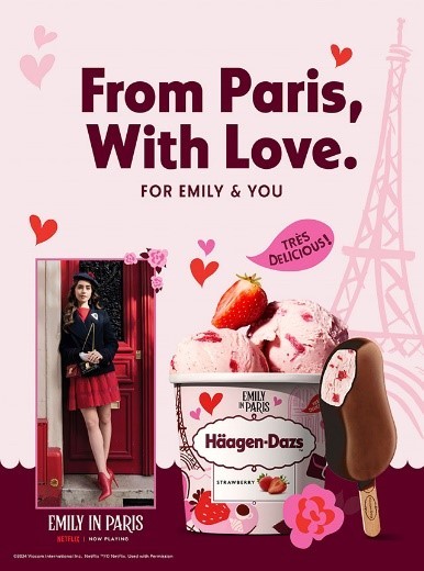 하겐다즈는 넷플릭스의 인기 시리즈 ‘에밀리 파리에 가다’와 글로벌 파트너십을 체결해 ‘한정판 딸기 아이스크림 패키지’를 선보였다. 이번 패키지는 에밀리의 프렌치 무드를 반영하여 디자인됐으며, 하겐다즈의 시그니처 플래버인 딸기 제품 한정으로 출시됐다.