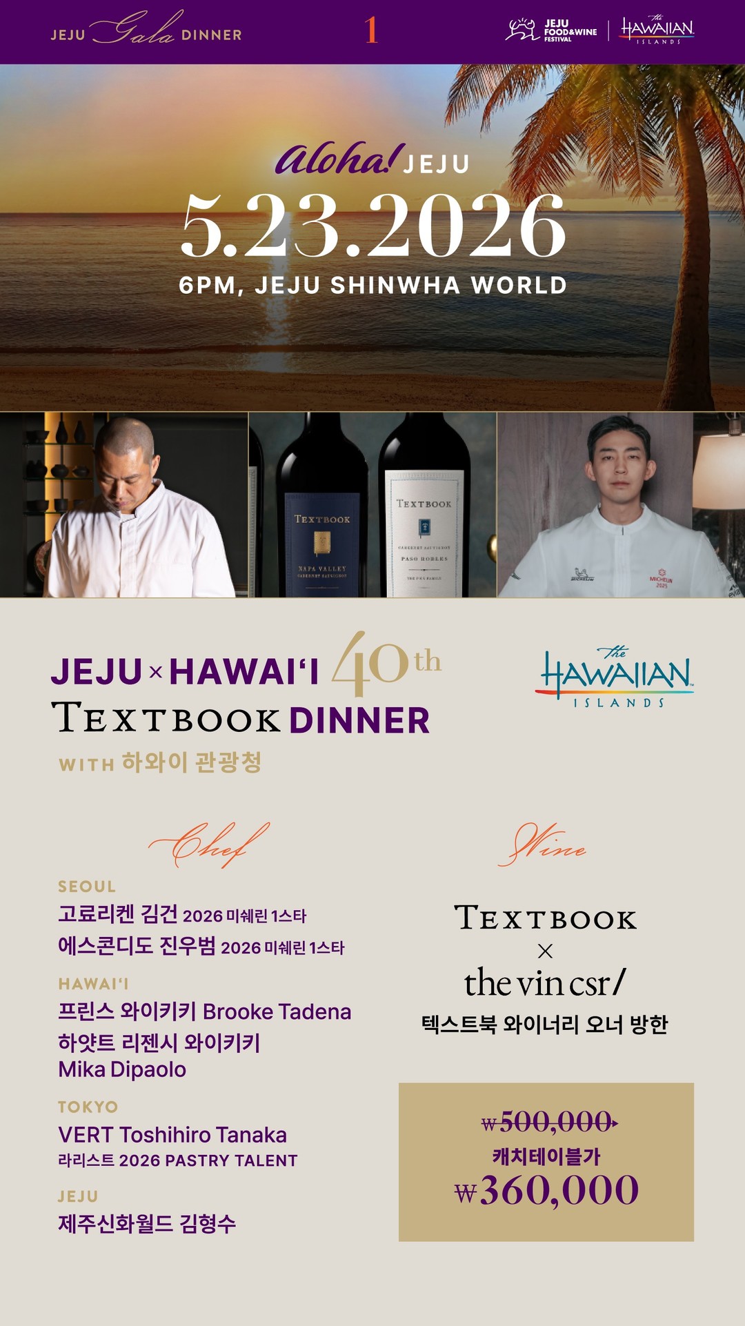 제주와 하와이의 미식 대화 첫 번째 디너인 5월 23일에는 제주-하와이 자매결연 40주년을 기념하여 하와이 관광청(Hawaii Tourism Authority)과 협업한 특별한 콜라보레이션이 펼쳐진다. 이번 디너는 하와이의 대표 셰프인 브룩 타데나(Brooke Tadena)와 미카 디파올로(Mika Dipaolo)를 비롯해, 국내 미쉐린 스타 셰프인 고로리켄 김건(1스타), 에스콘디도 진우범(1스타) 등이 참여해 두 섬의 미식 문화를 잇는 가교 역할을 한다. 제주의 식재료에 하와이의 감성을 더해 현대적인 미식 언어로 풀어내며, 특히 미국 나파밸리의 아이코닉 와이너리 ‘텍스트북(Textbook)’의 오너가 직접 방한해 와인에 담긴 철학을 공유하는 스페셜 페어링 세션을 진행하며 미식 경험의 깊이를 더할 예정이다.