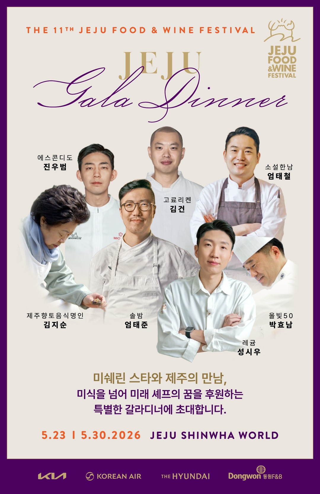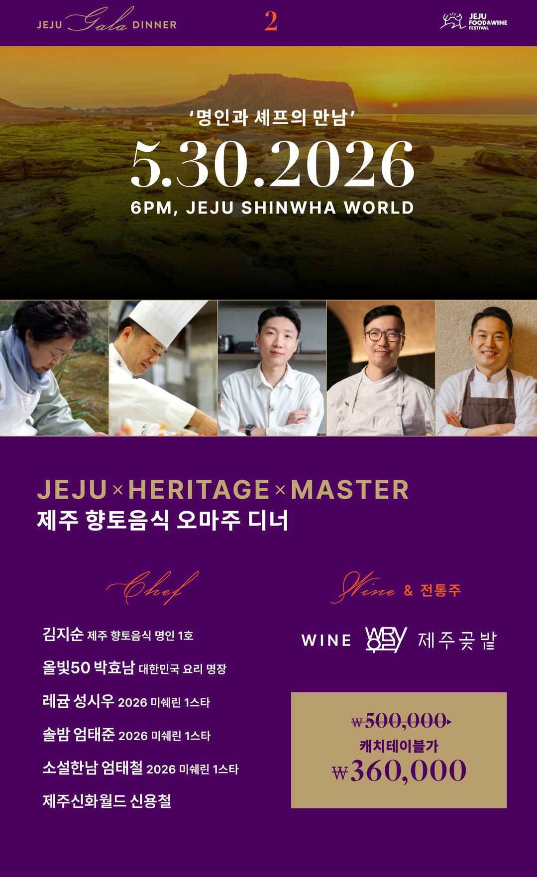 전통의 미래를 잇다 두 번째 디너인 5월 30일에는 제주 향토음식의 원형을 현대적으로 재해석한 ‘오마주 디너’가 열린다. 이번 디너의 중심에는 제주 향토음식 명인 1호 김지순 명인이 자리하며, 명인이 지켜온 제주의 미식 유산을 성시우(레귬, 1스타), 엄태준(솔밤, 1스타), 엄태철(소설한남, 1스타) 미쉐린 스타 셰프들이 각자의 감각으로 재해석한 헌정 메뉴들을 선보인다. 특히 대한민국 요리명장 박효남 셰프가 합류해 전통의 깊이에 현대적 세련미를 더한 독창적인 6코스 요리를 완성하며, 프리미엄 전통주 ‘우리막걸리(WRY)’와 ‘제주곶밭’ 등을 활용한 페어링을 통해 K-푸드의 진정한 정수를 경험할 수 있는 특별한 순간을 선사할 예정이다.