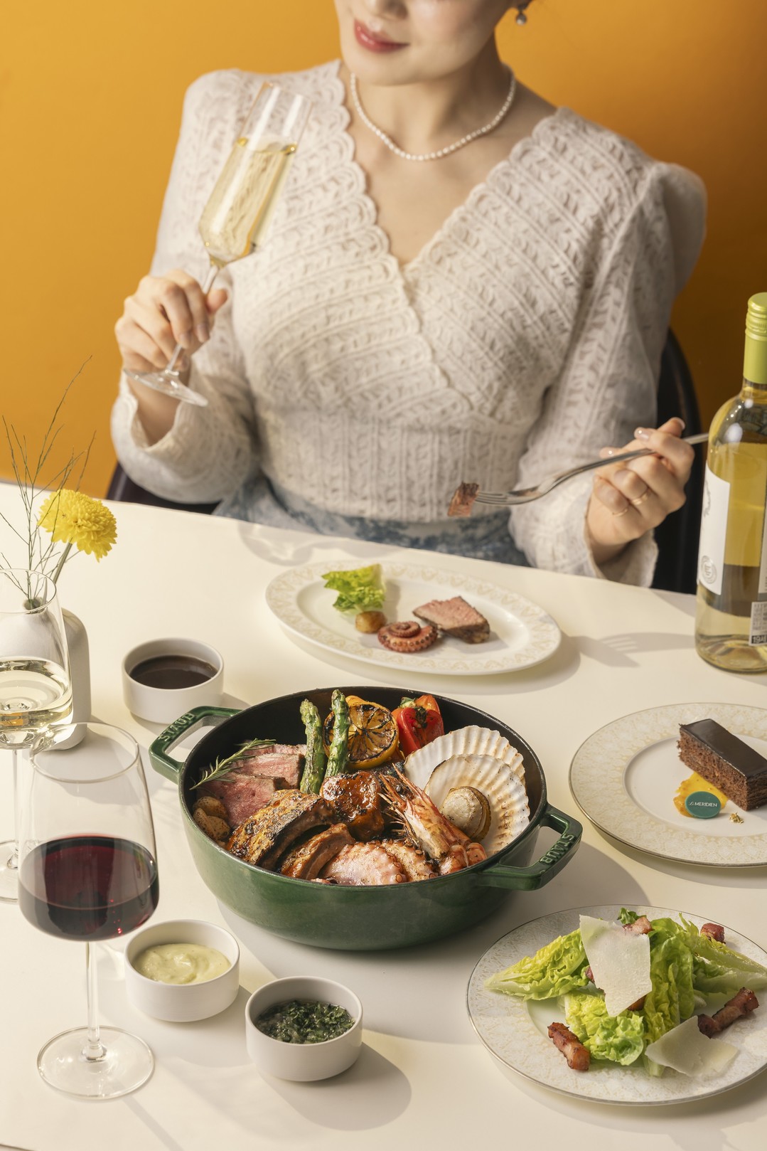 - 시원한 청량감을 더해 줄 스파클링 와인을 시작으로 애피타이저와 서프 앤 터프 스타일의 플래터 및 디저트 등 3코스 요리와 와인 1병으로 구성된 페어링 세트 합리적인 가격에 선봬
