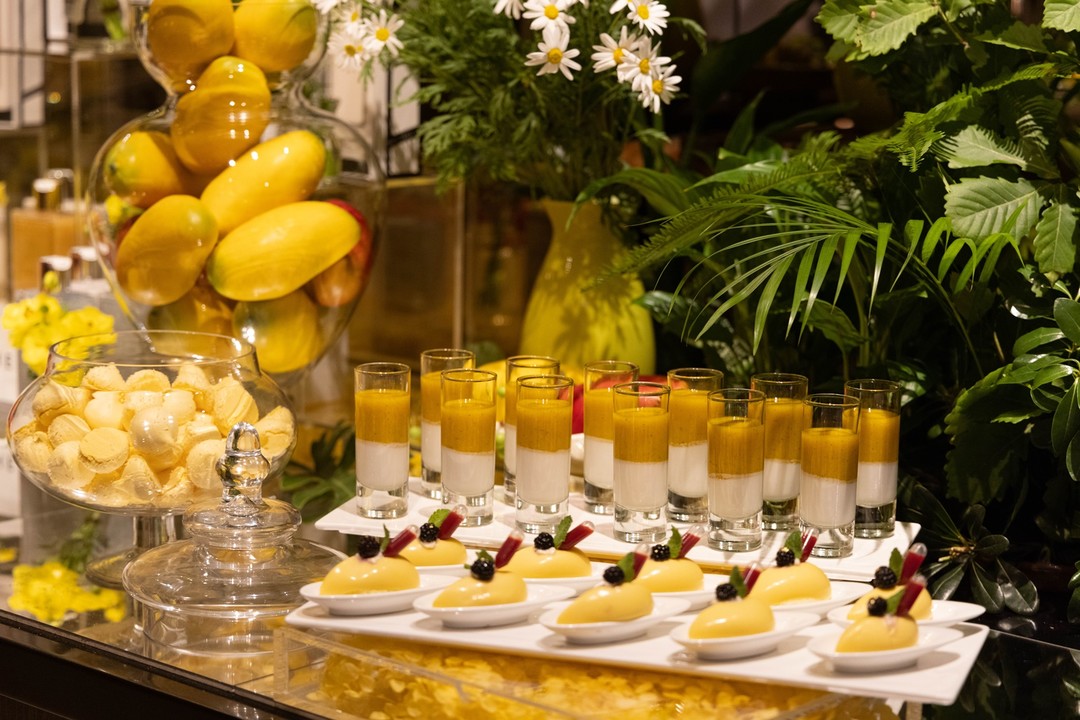망고 뷔페에는 웰컴 푸드와 드링크로 생망고와 망고 셔벗, 망고에이드가 개별 제공되며 망고 타르트, 망고 크레페, 망고 케이크 등 망고를 소재로 한 디저트 메뉴 26종과 파스타 샐러드, 흑가자미 구이, 열무김치국수, 아란치니, 샤퀴테리, 치즈 등 스페셜 메뉴 20종 그리고 홍차 또는 커피가 제공된다. 판매가는 1인 기준으로 성인 6만 7천 원(이하 봉사료, 세금 포함), 소인 4만 원이다.
