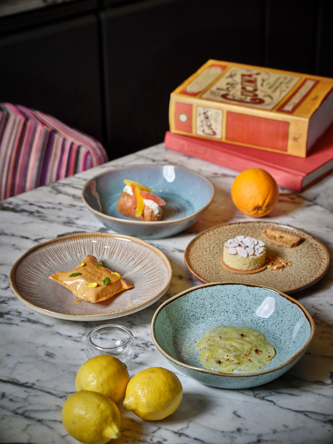 이어지는 파스타는 참나무 장작으로 구운 농어에 샤프란 프레골라를 곁들인 ‘스피골라’, 오징어 먹물로 만든 아말피 스타일 링귀니, 시칠리아식 가지 뇨끼, 이탈리아산 보타르가가 곁들여진 풀리아 전통의 열무 파스타 ‘오르키에테 콘 치메 디 라파’ 중에서 선택 가능하다. 메인 요리로는 한우 1++ 안심 구이, 이탈리아 사르데냐 지역의 대표적인 요리인 랍스터 카탈라나, 허브 크러스트를 올려 화덕 오븐에 구운 양갈비, 재료 본연의 신선함이 조화를 이루는 광어 아쿠아파짜, 앤초비 등의 이탈리아 식재료를 이용하여 속을 채운 시칠리아 전통 통오징어 구이 등 다양한 메뉴가 마련되어 있으며, 마무리는 각 지역의 특색을 담은 각기 다른 지역의 특색을 담은 4가지 디저트 중 취향에 따라 선택 가능하다. 샤프란 꿀을 곁들인 사르데냐식 리코타 세아다스, 브론테 피스타치오 젤라토를 곁들인 아몬드 케이크, 리몬첼로를 적신 바바, 시트러스 카르파치오와 엑스트라 버진 올리브오일 젤라토가 준비되어 있으며, 가격은 1인 18만9천원이다.