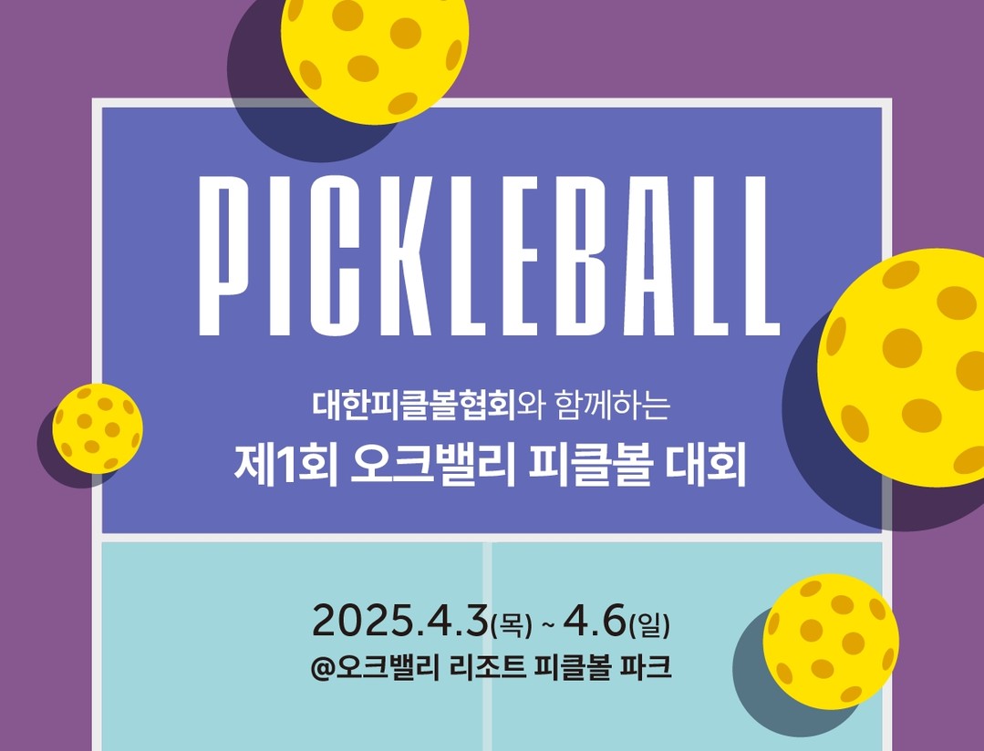 참가 신청은 대한 피클볼 협회 공식 웹사이트를 통해 3월 2일까지 접수할 수 있고, 참가비는 1인 기준 3만 원이다. 경기 전후 컨디션 조절을 통해 편안하게 대회에 집중할 수 있도록 참가자 대상으로 최대 30% 특가 할인이 적용된 균일 요금으로 오크밸리 리조트 객실을 이용할 수 있는 혜택도 제공한다.