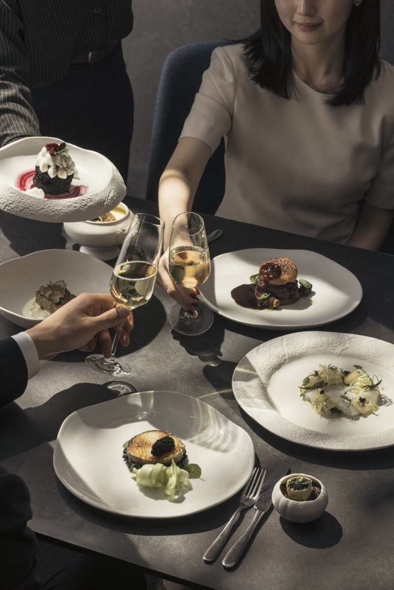 디너 코스는 총 다섯 가지로 구성되며, 셰프의 기량과 계절의 재료를 담아낸 아뮤즈 부슈 (Amuse-bouche)로 시작된다. 아뮤즈 부슈(Amuse-bouche)는 프랑스어로 ‘입안의 즐거움’을 의미하는 한 입 크기의 에피타이저로, 정찬 전에 셰프의 감각을 담아낸 한 입의 에피타이저로 무늬오징어와 관자를 활용한 크루도가 준비되어 첫 순간부터 미식의 기대감을 높인다. 이어 오세트라 캐비어와 이탈리아 스파클링 와인 프레시넷 프로세코(Freixenet Prosecco)가 어우러지며, 랍스터 차우더 수프와 오징어 먹물 라비올리가 깊고 풍성한 맛을 선사한다. 구운 버섯 라자냐와 블랙 & 화이트 트러플이 절제된 풍미의 정점을 이루며, 메인으로는 한우 투르네도 로시니(Grilled Hanwoo Tournedos Rossini)와 대구 스테이크 흑미 리조토 중에서 선택할 수 있다. 마지막은 깊고 진한 풍미가 살아 있는 블랙 코코아 케이크로 마무리된다.