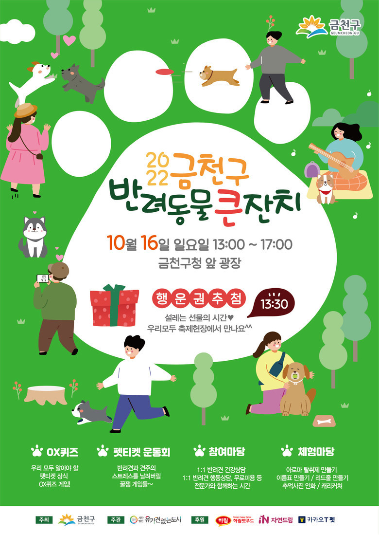 [스마트시니어뉴스=마정수 기자] 서울 금천구(구청장 유성훈)는 10월 16일(일) 오후 1시 금천구청 광장에서 ‘반려동물 큰잔치’를 개최한다. 반려동물 큰잔치는 사람과 동물이 행복하게 살아가는 반려문화의 기틀을 다지고, 생명존중 의식을 확산시키기 위해 마련됐다. 행사는 반려문화 교육 및 행사 전문 비영리 시민단체 (사)유기견없는도시가 주관한다.