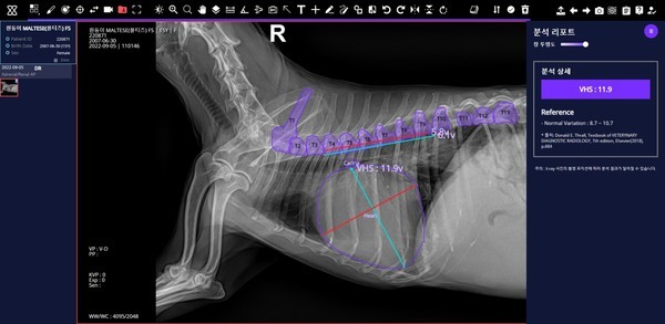 수의사가 엑스레이 사진을 엑스칼리버에 올리면, AI가 부위별로 이상 여부를 분석해 결과를 제시한다. 이전에는 반려견 심장 크기를 측정하고 흉부 질환을 진단하려면 기존에는 수의사가 흉추를 기점으로 엑스레이에서 길이를 측정해 심장 위치를 파악하는 과정을 거쳤다.