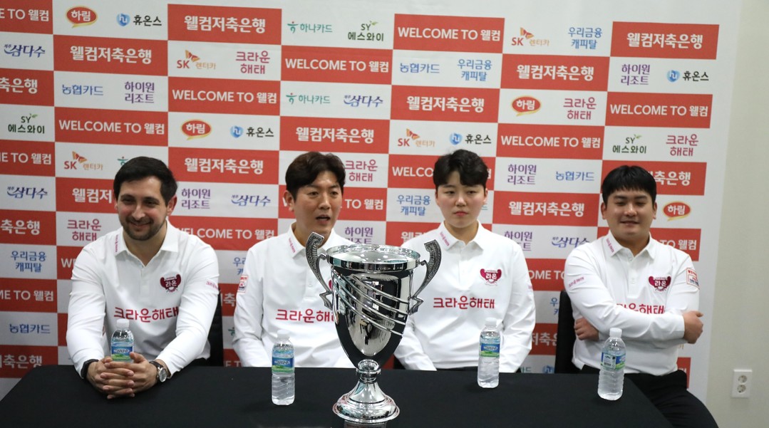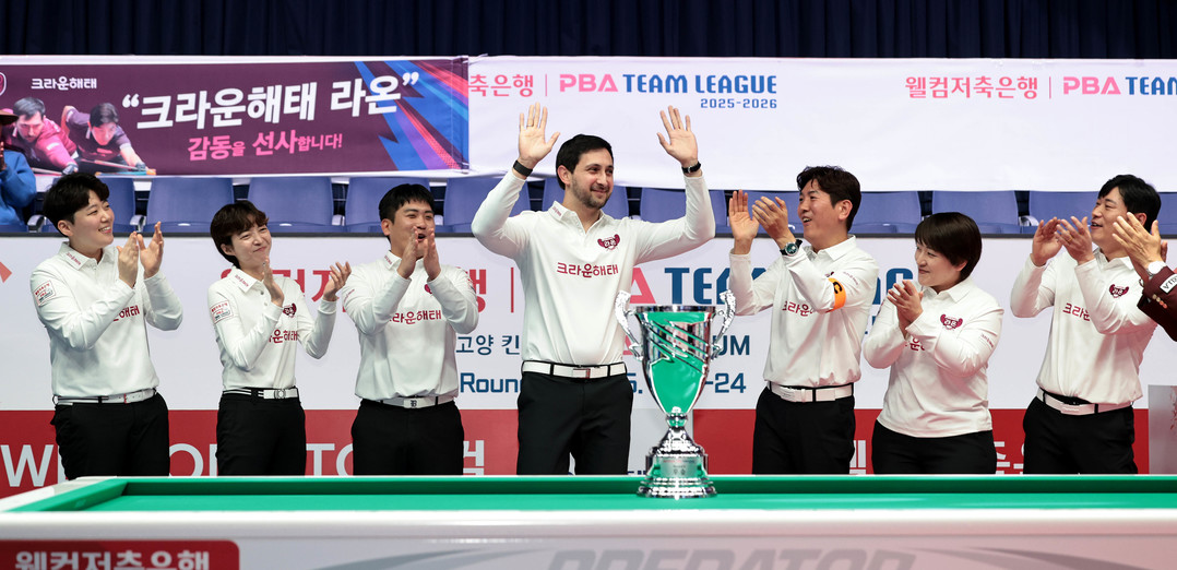 [욜드(YOLD)=조용수 기자] PBA 팀리그 크라운해태가 ‘약체 오명’을 벗고 PBA 팀리그 4라운드 정상에 섰다. 24일 경기도 고양시 ‘고양 킨텍스 PBA 스타디움’에서 열린 ‘웰컴저축은행 PBA 팀리그 2025-2026’ 4라운드 최종일서 크라운해태는 휴온스를 상대로 세트스코어 3:4로 패배했다. 그러나 우승 경쟁 팀인 SK렌터카도 하이원리조트에 3:4로 패배하면서 승점에서 크라운해태(승점 19)가 SK렌터카(승점 18)에 앞서 우승컵을 들었다.